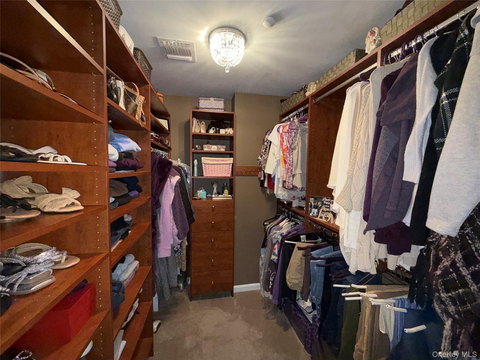 - Bathroom featuring a stall shower, double vanity, light tile patterned floors, and a walk in closet