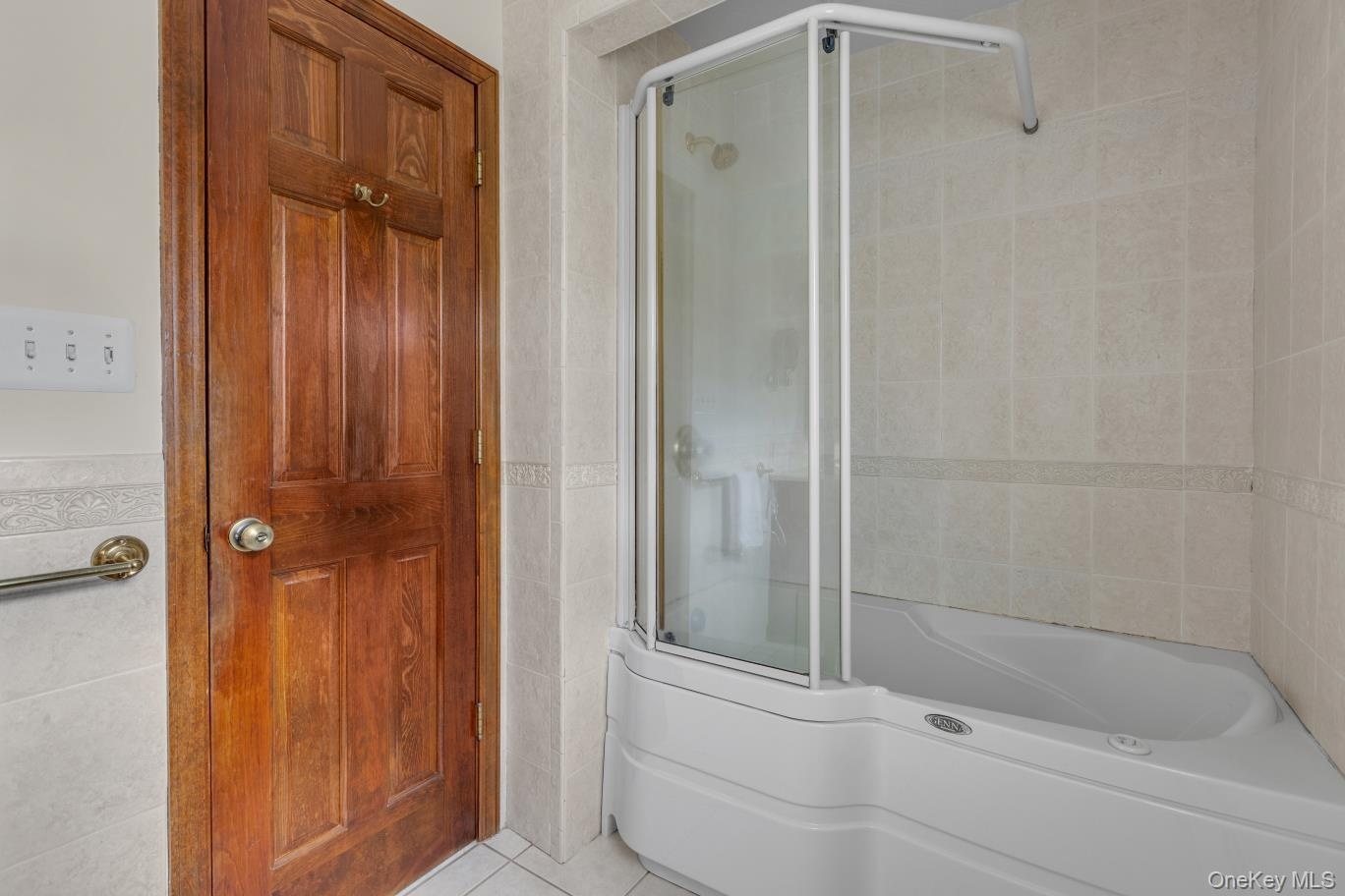 - Bathroom featuring tile walls, tile patterned floors, and combined bath / shower with glass door