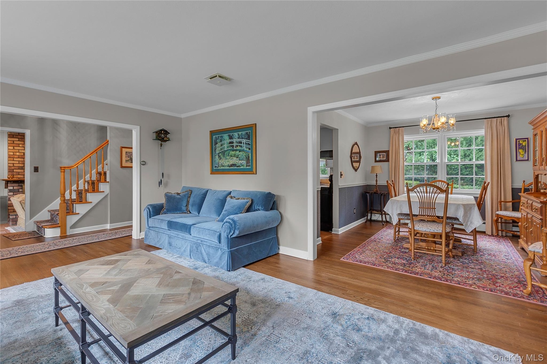 - Living area featuring crown molding, wood finished floors, a chandelier, and stairway