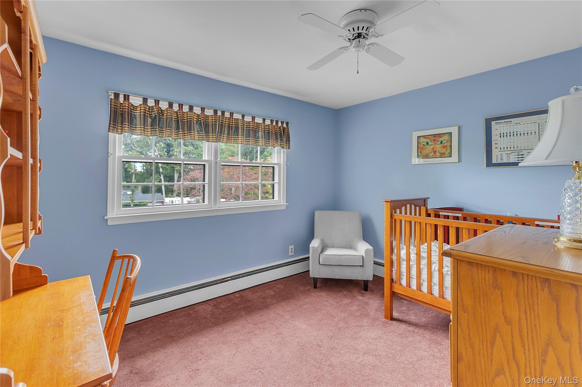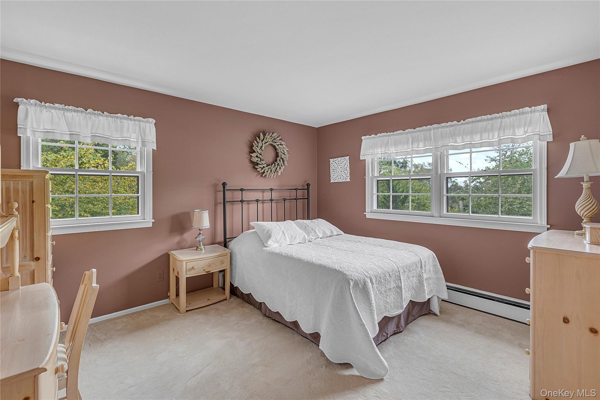 - Carpeted bedroom with a baseboard heating unit and baseboards
