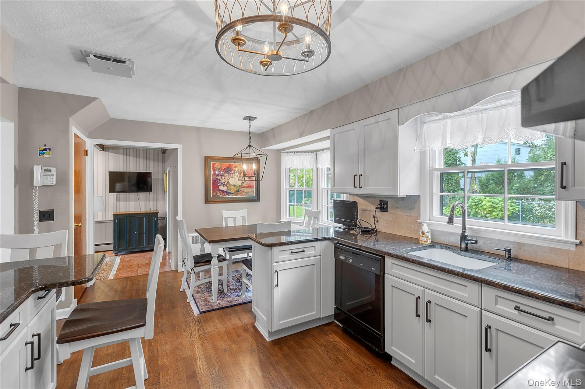 - Kitchen featuring white cabinets, dark stone counters, dark wood-style floors, and black dishwasher