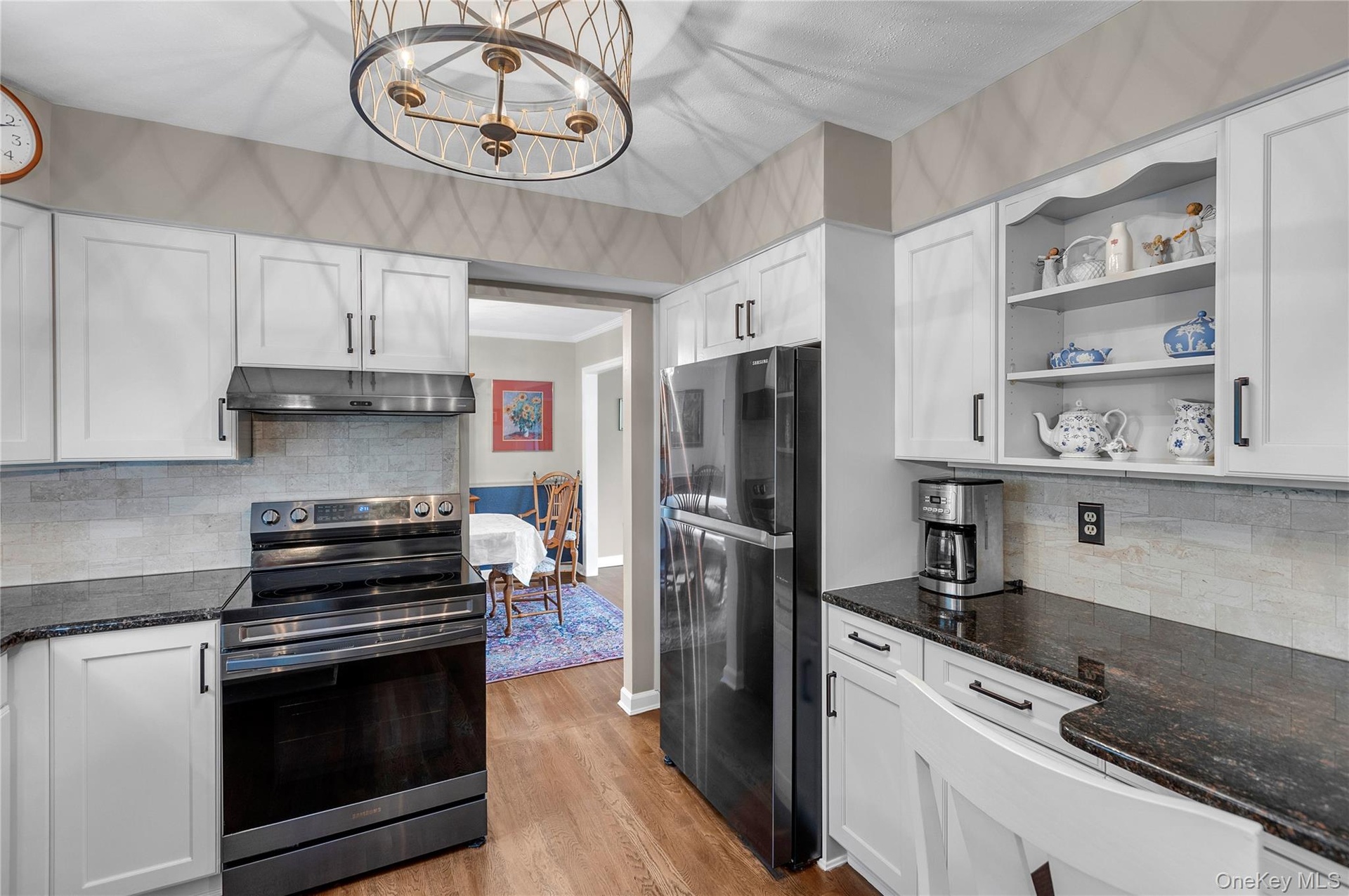 - Kitchen featuring backsplash, dark stone countertops, open shelves, and stainless steel electric range