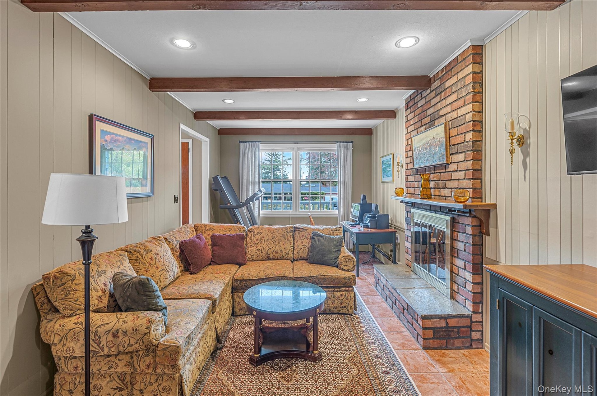 - Living room featuring wooden walls, beamed ceiling, a brick fireplace, light tile patterned floors, and recessed lighting
