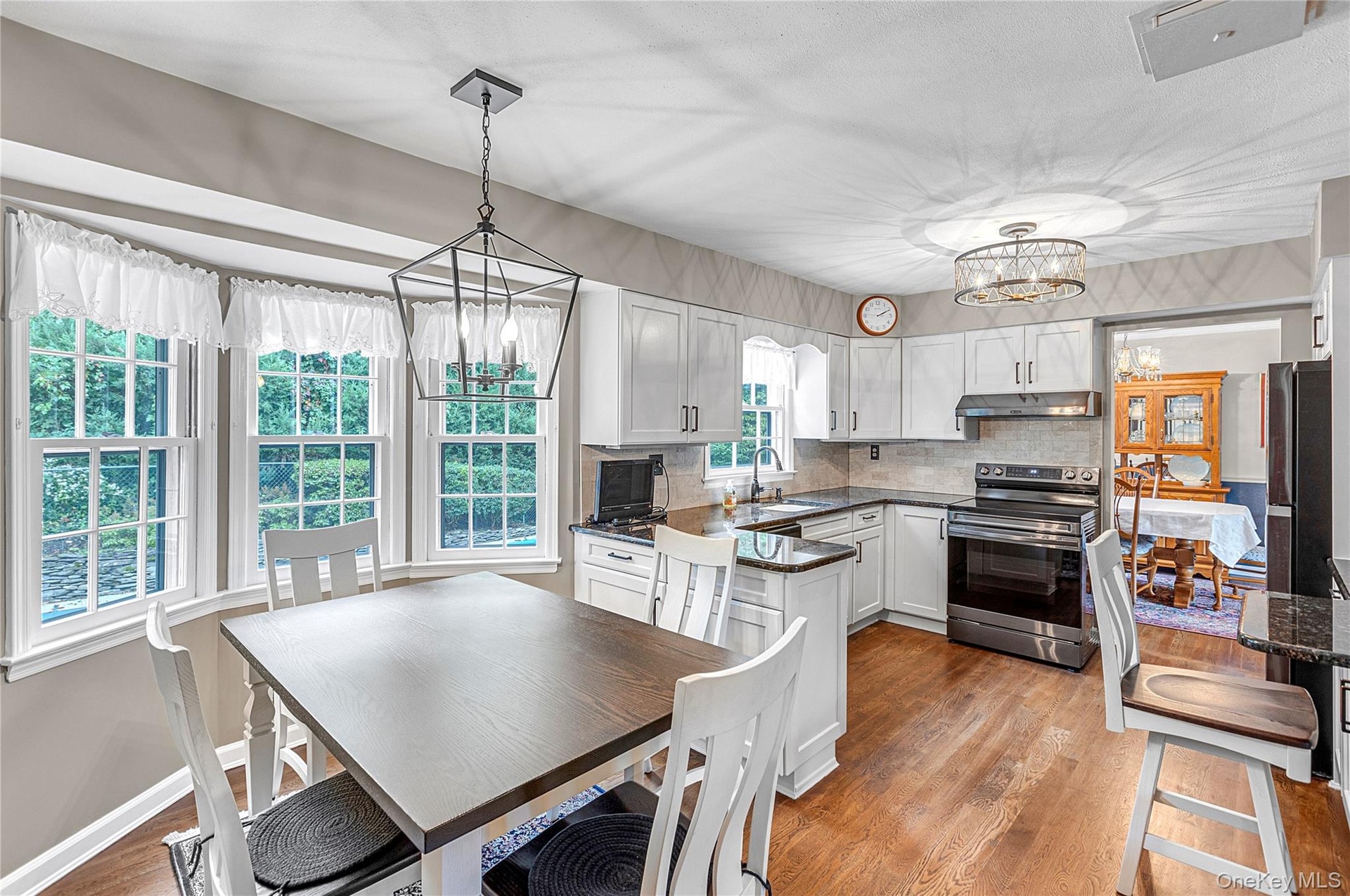 - Kitchen featuring a chandelier, stainless steel range with electric cooktop, white cabinets, and tasteful backsplash