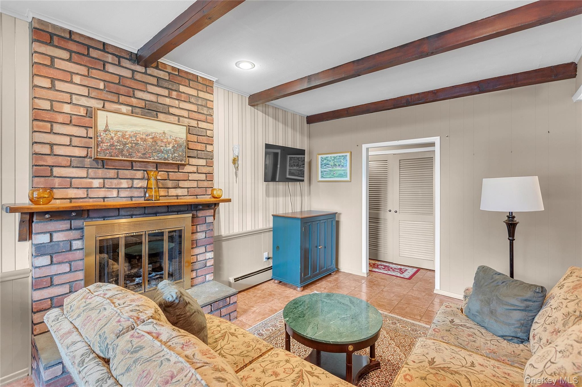 - Living area featuring a brick fireplace, beam ceiling, a baseboard radiator, light tile patterned flooring, and wood walls