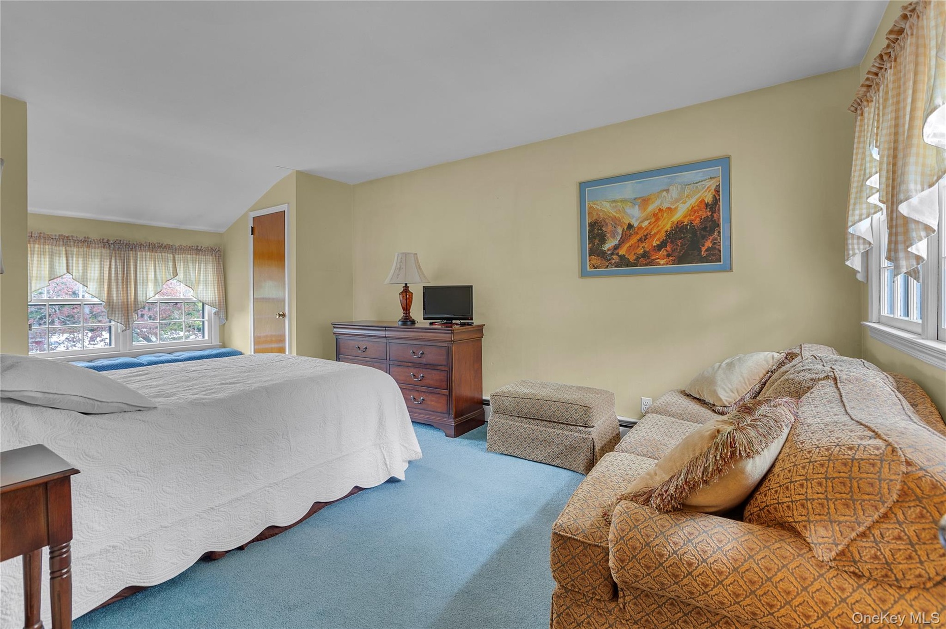 - Bedroom with multiple windows, carpet, and lofted ceiling