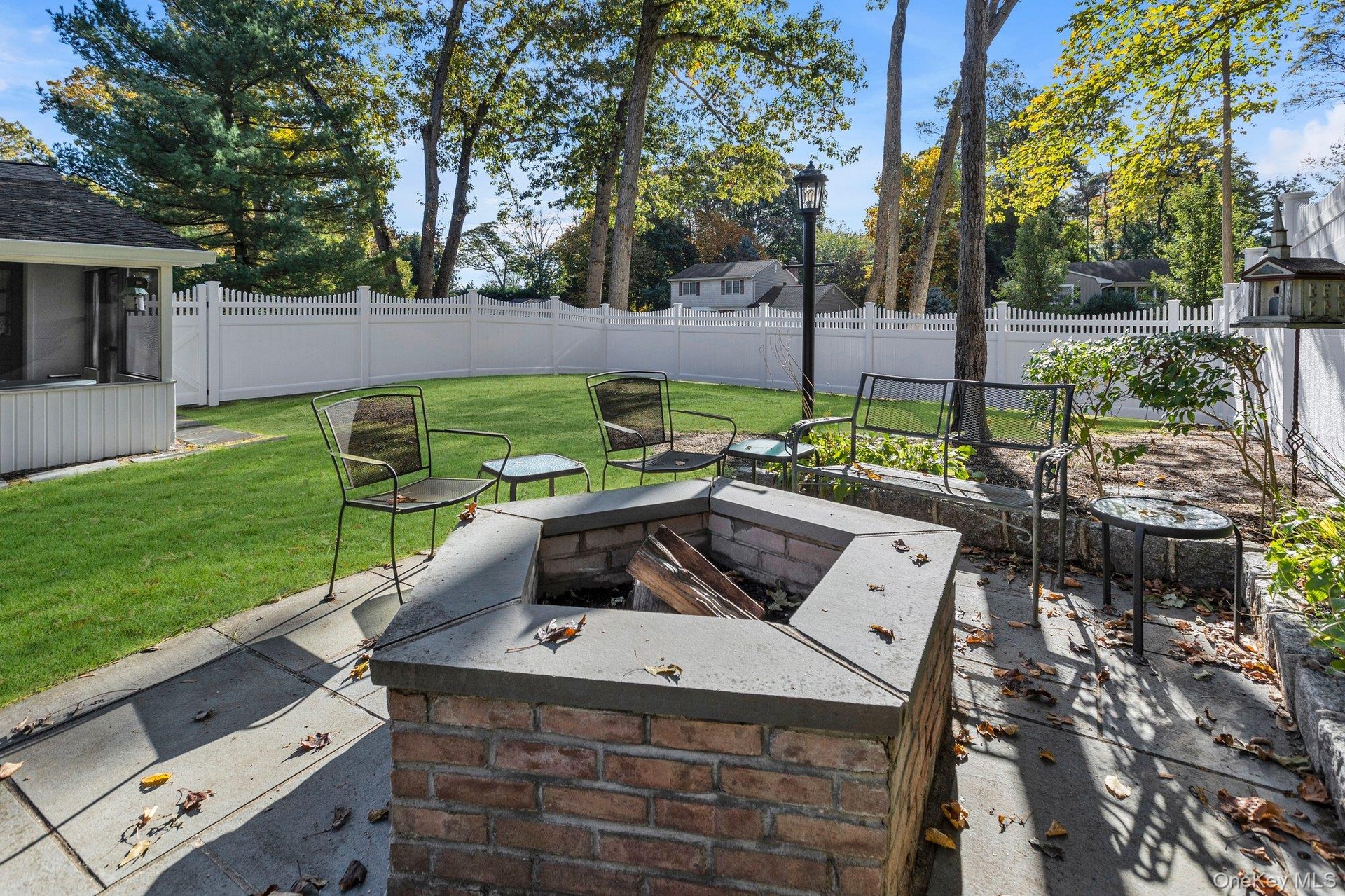 - Fenced backyard with a patio area, an outdoor fire pit, and view of scattered trees