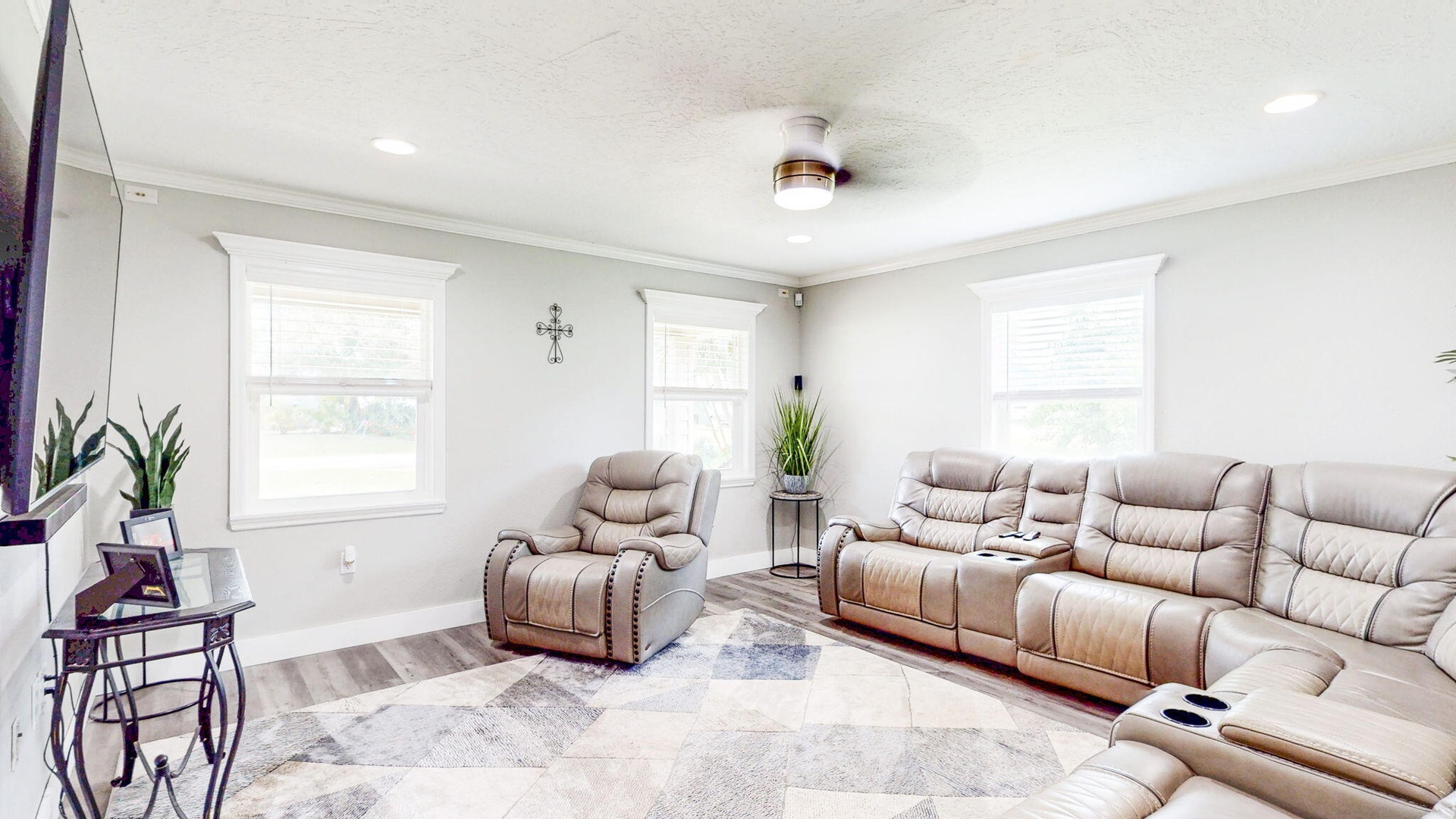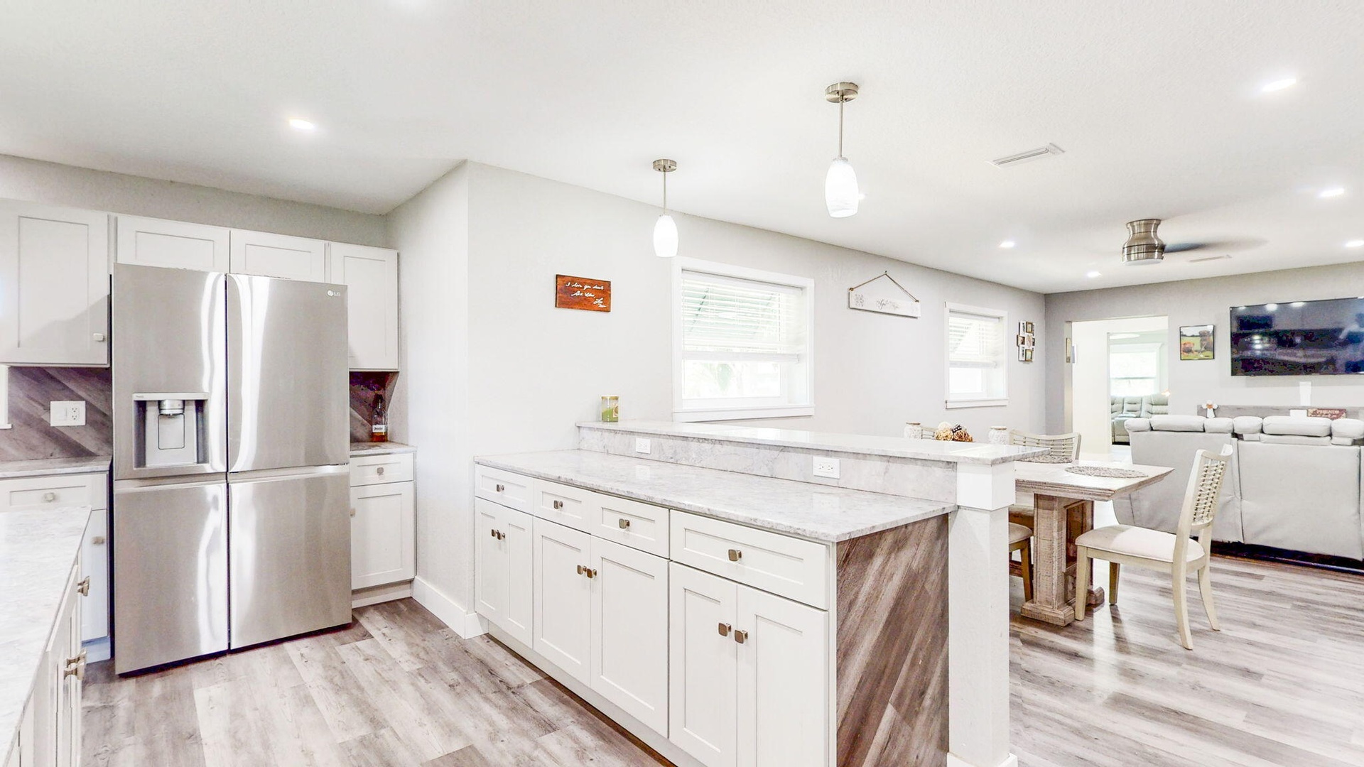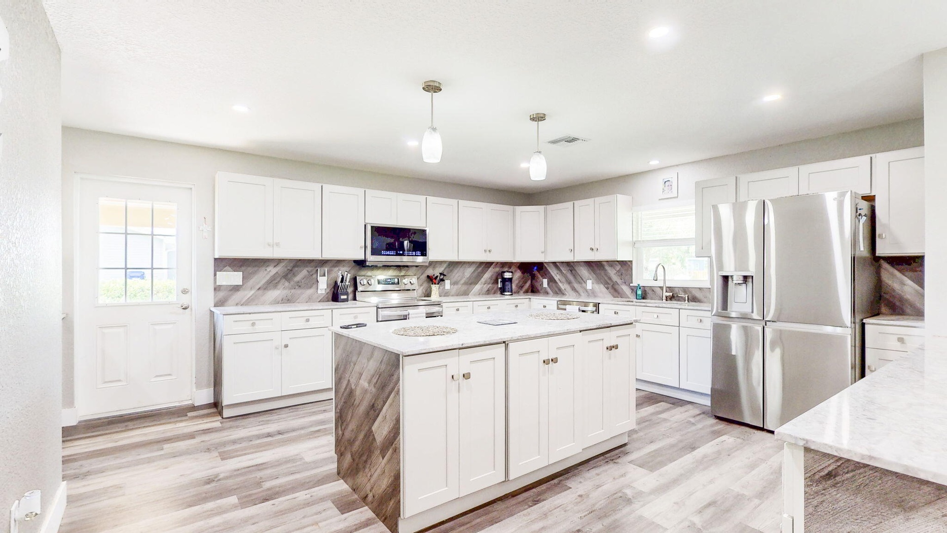 Welcome to this beautifully remodeled 4-bedroom, 3-bathroom home. Designed for both comfort and functionality, the property offers a spacious layout and a wide range of modern enhancements. Inside,you'll find luxury vinyl flooring throughout, two new air conditioning systems and two new hot water heaters, The guest bathroom features a jacuzzi tub, and impact windows and doors provide energy efficiency and storm protection. The home is also equipped with a setup for a whole-house generator. The kitchen, baths, and living spaces have all been completely remodeled, creating a fresh and move-in ready environment. Outdoor living is maximized with a wrap-around porch finished with Trex decking, a fire pit in the front yard, a carport, and a detached garage. The expansive yard is irrigated by
