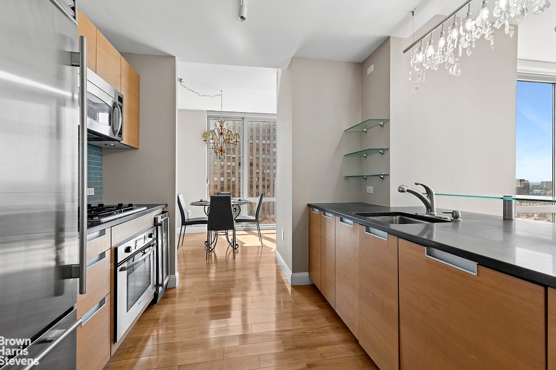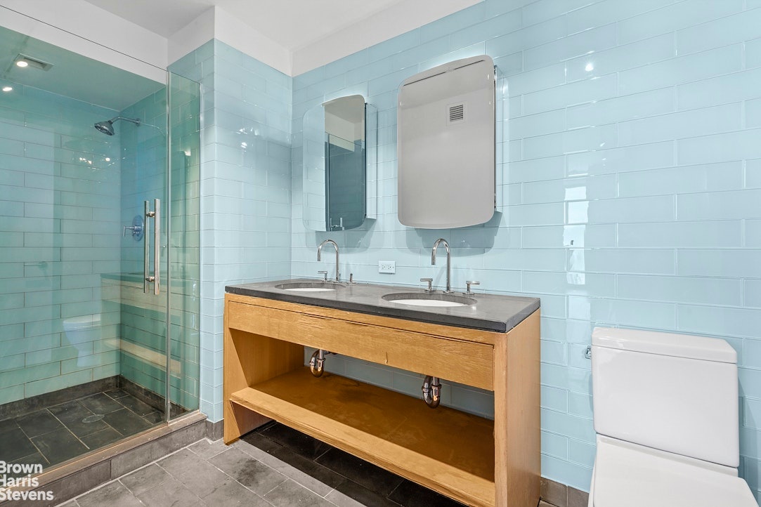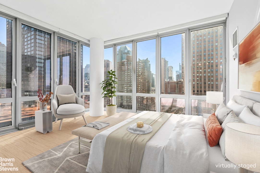 The thoughtful split-bedroom layout is designed for modern living and entertaining. A sleek open chef's kitchen is appointed with Bosch appliances, a Sub-Zero refrigerator, Poggenpohl cabinetry, and bluestone countertops, flowing seamlessly into the dining area with open southwestern exposures. Ten-foot, floor-to-ceiling wraparound windows create a sense of volume and light, while hardwood floors and ample closets provide warmth and function. An in-unit washer/dryer enhances convenience.
