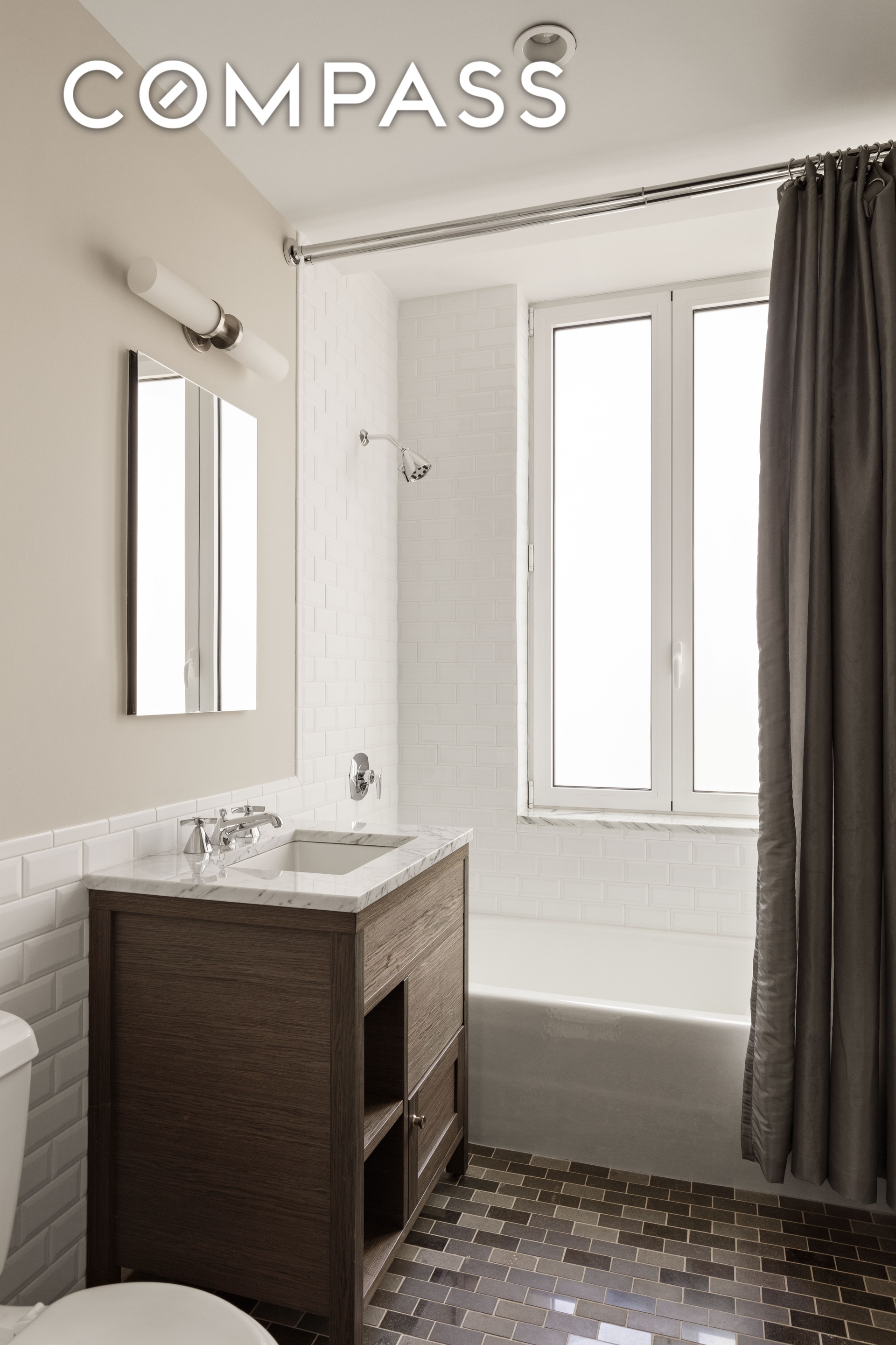 Both bedrooms are generously sized, and the primary bathroom includes a soaking tub and double vanity. Additional features include hardwood floors, an in-unit washer/dryer, and ample storage.