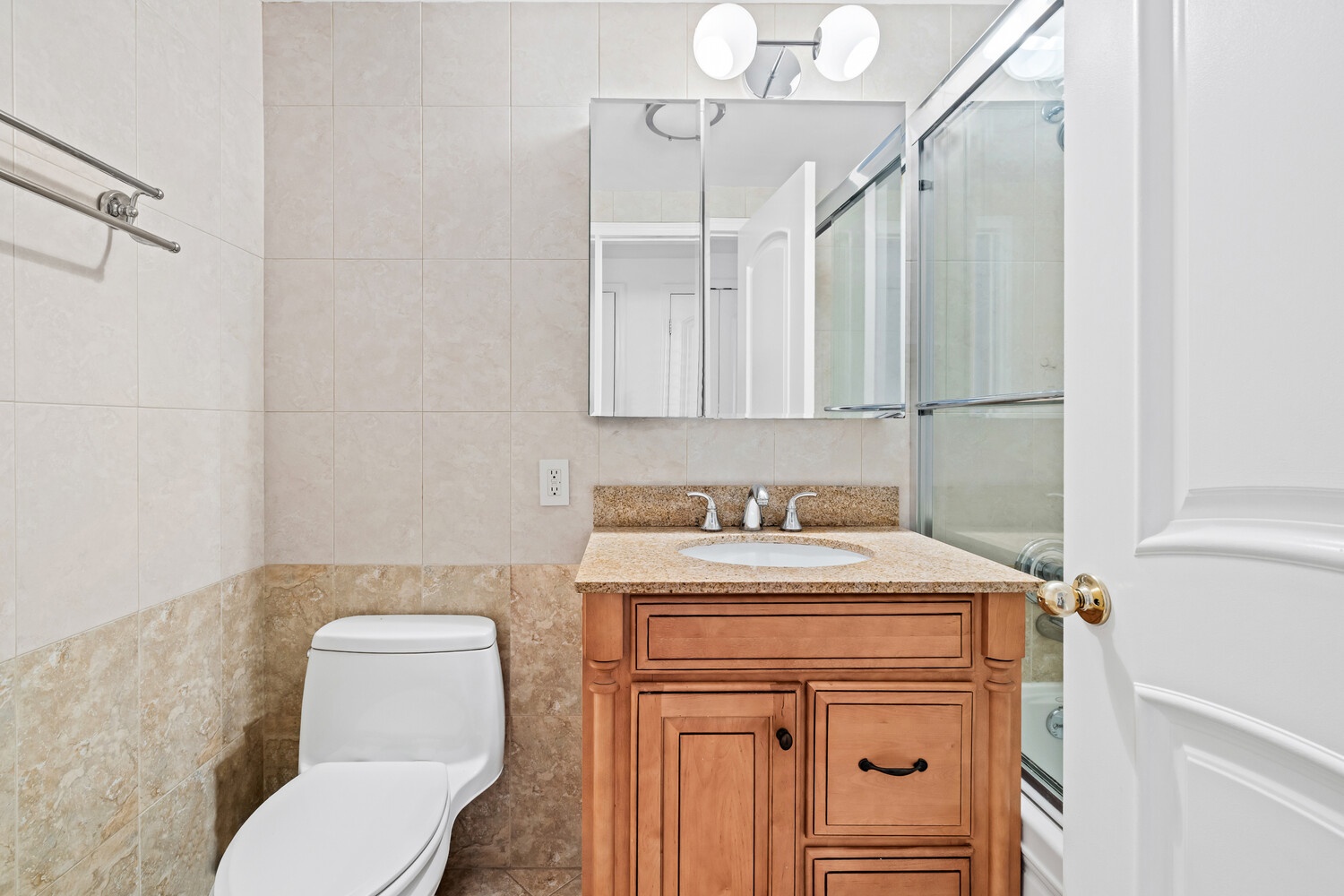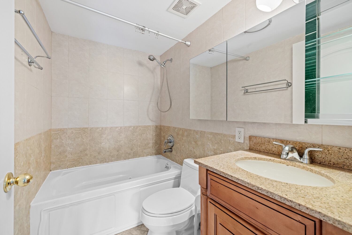 Inside, the apartment welcomes you with warm hardwood floors and a spacious open-concept living and dining area-perfect for relaxing or entertaining. The chef-friendly kitchen is outfitted with stainless steel appliances (including a dishwasher), a center island with seating, and plenty of cabinet space. A long hallway separates the living space from the private quarters, leading to both bedrooms, each with southern exposures overlooking your tranquil garden. The primary suite includes an en-suite bathroom with a Jacuzzi-style soaking tub and direct access to the backyard.