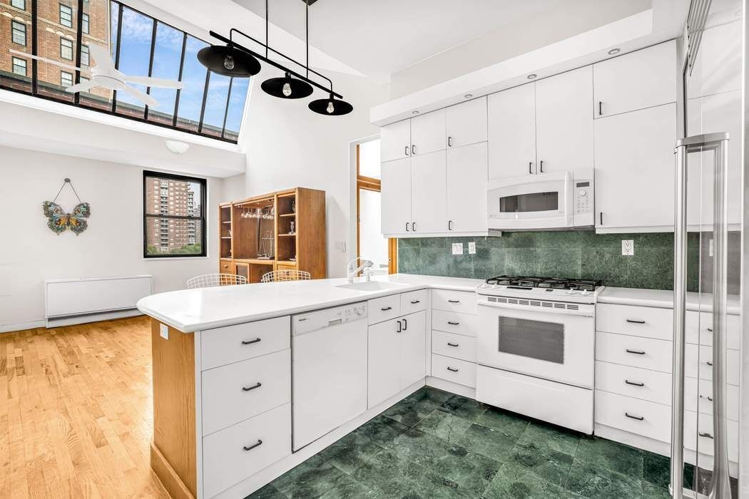 This apartment is the whole length of the building on the north side, with over 50 feet of skylights and 9 windows facing East & North, allowing tons of light into this spacious home.
