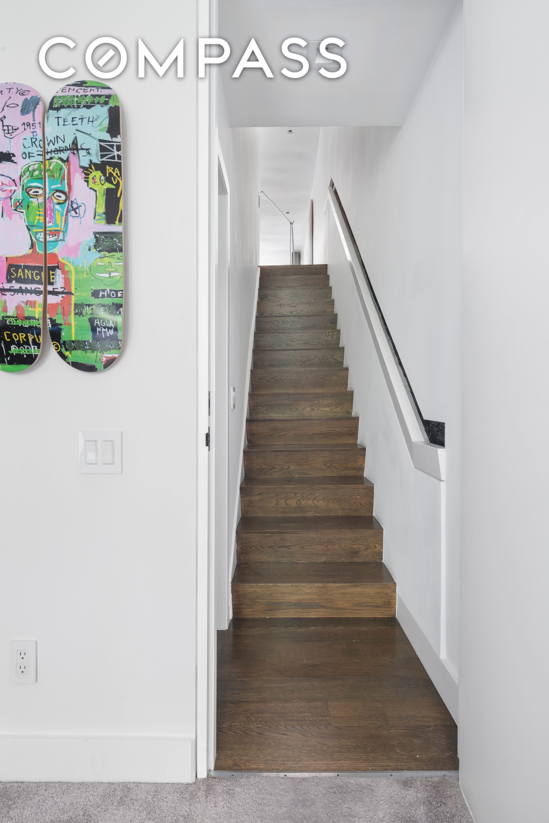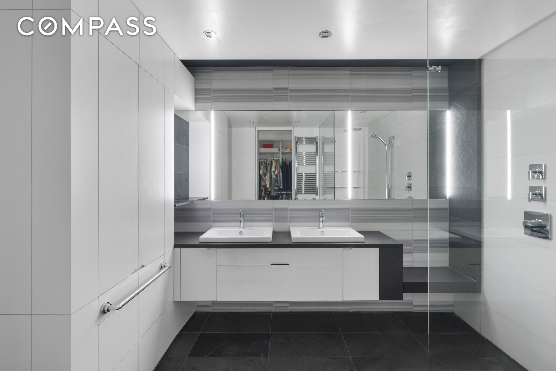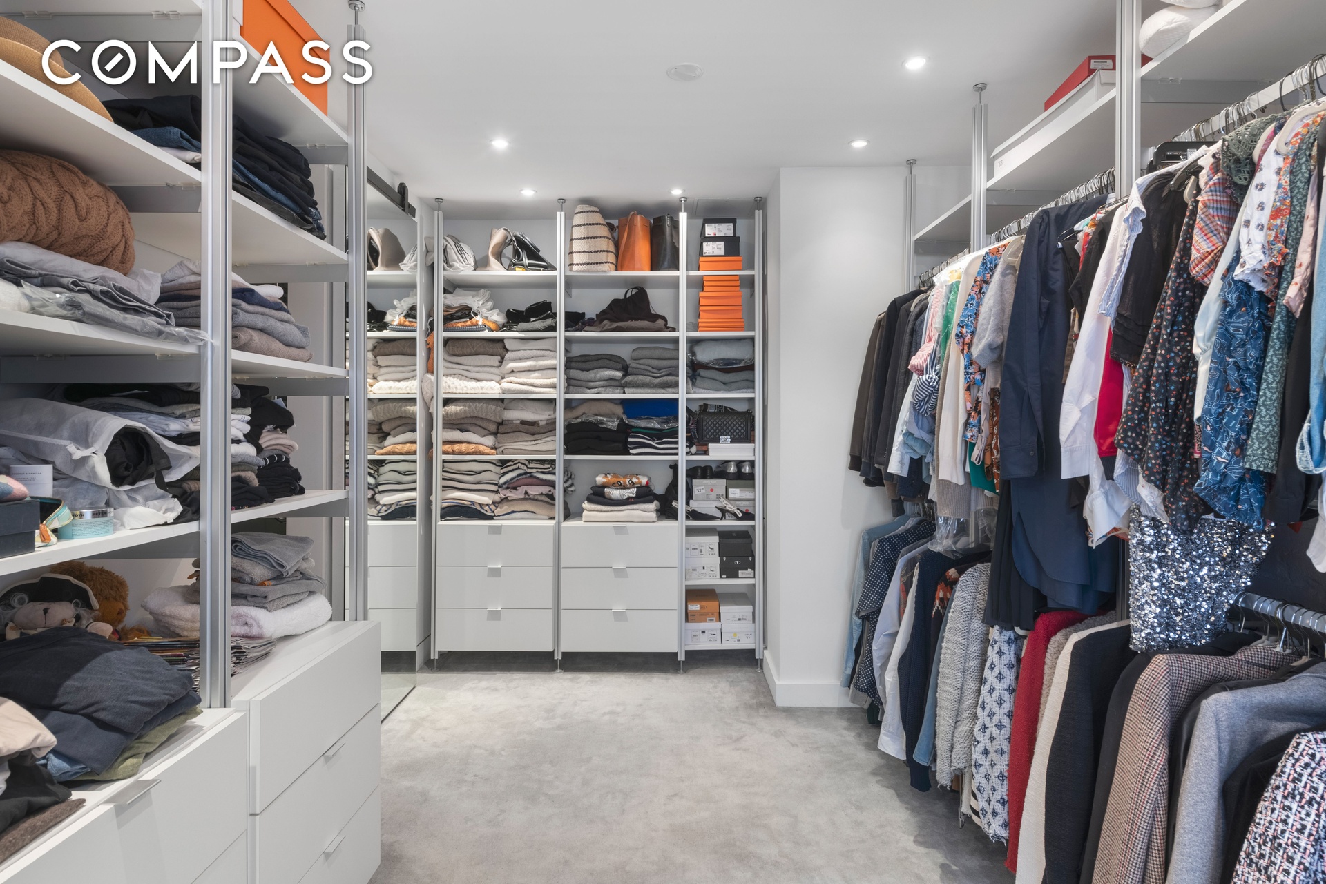 The primary suite offers a generous walk-in closet that functions equally well as a dressing room, home office, or nursery. Its en-suite bathroom evokes a spa-like calm, complete with radiant heated floors and a towel warmer. The duplex layout provides separation and privacy for the secondary bedroom, tucked into the trees with sunny southern exposures and its own full bath — perfect as a private bedroom, guest suite, or quiet home office.