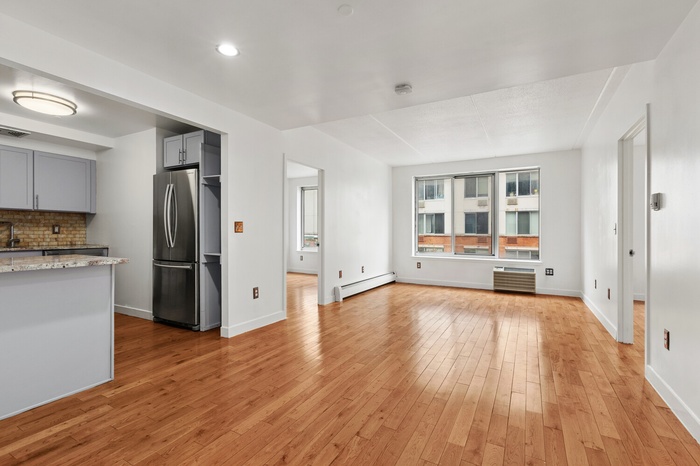 This unit is 797 square feet, has hardwood floors throughout, and large windows flood the space with natural light. The apartment overlooks the residents' private landscaped outdoor space.