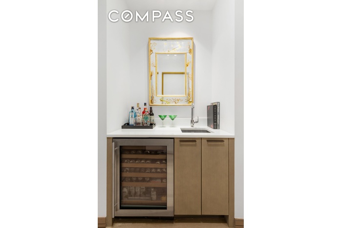 The sleek and open-concept kitchen is anchored by an extra large island with bar-seating, perfect for entertaining and casual dining. This chef’s kitchen has been tastefully appointed with a paneled Subzero refrigerator, freezer, and dishwasher, Bertazzoni double ovens and hooded stove, dual-zone wine refrigerator, Dornbracht fixtures, and recessed lighting overhead. The attractive European oak cabinetry extends to the ceiling and is complemented by antique grey marble slab backsplash and polished glass composite slab countertops.