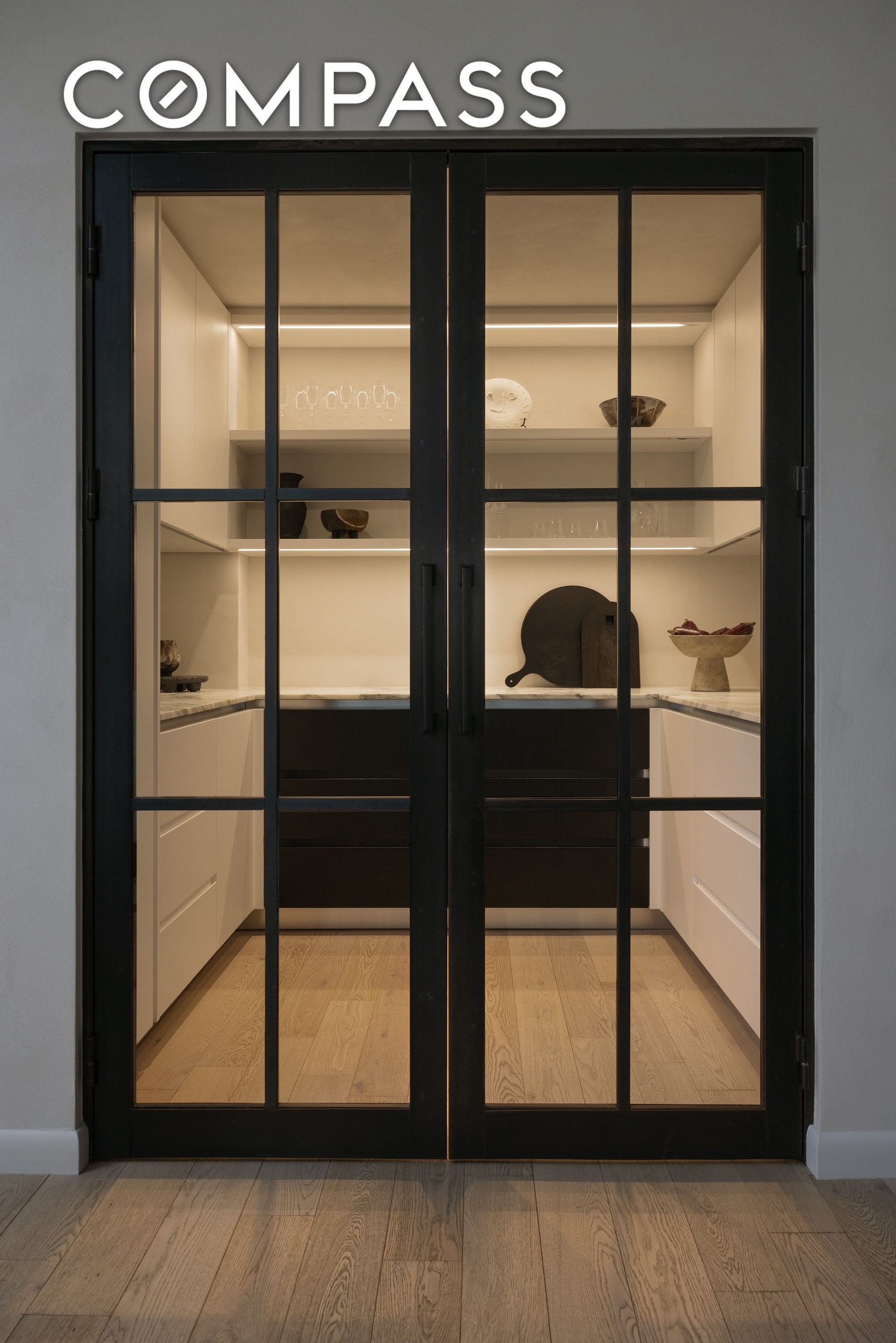 Inside, no detail has been overlooked. Direct elevator access, featuring a Future Automation security door, leads to a sunlit entry foyer with integrated storage and a powder room. The open-concept living, dining, and kitchen area showcases panoramic skyline views and a bespoke Rifra kitchen with dual waterfall islands, handcrafted cabinetry, a walk-in pantry, a TopBrewer coffee and beverage station, and fully integrated Miele appliances, a seamless union of form and function.