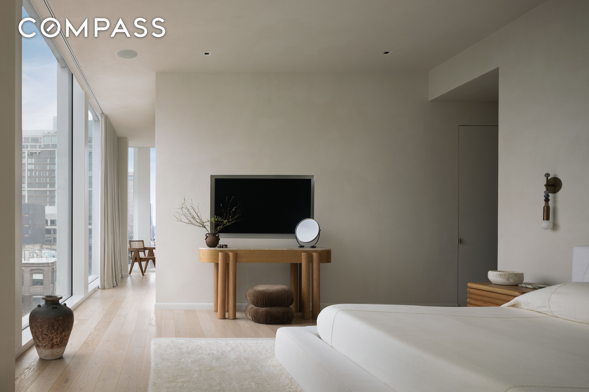 The primary suite is a sanctuary in its own right, framed by floor-to-ceiling windows and anchored by an oversized walk-through closet. Its spa-quality en-suite bathroom is clad in radiant-heated travertine and Calacatta Paonazzo marble, with a floating Rifra double vanity and a wet room featuring a soaking tub and dual rainfall showers. Additional bedrooms offer generous custom closets and share a designer-appointed bathroom with Dornbracht fixtures and a deep soaking tub.