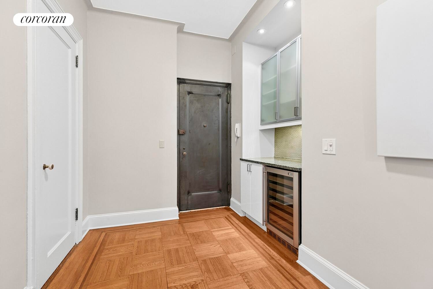 The apartment is renovated and very quiet throughout! Enter through the separate entry foyer measuring 8'2" X 8'11" with an extra-large coat closet and an adjacent wet bar with a GE Monogram wine cooler. The spacious living room can accommodate a large sectional sofa with plenty of room to spare for a large dining table. The bedroom comes with a ceiling fan, 2 large custom fitted closets (one of them can be used as a desk/office) and measures 11'6" X 11'10", accommodating a King Size bed, with room for nightstands and dressers.