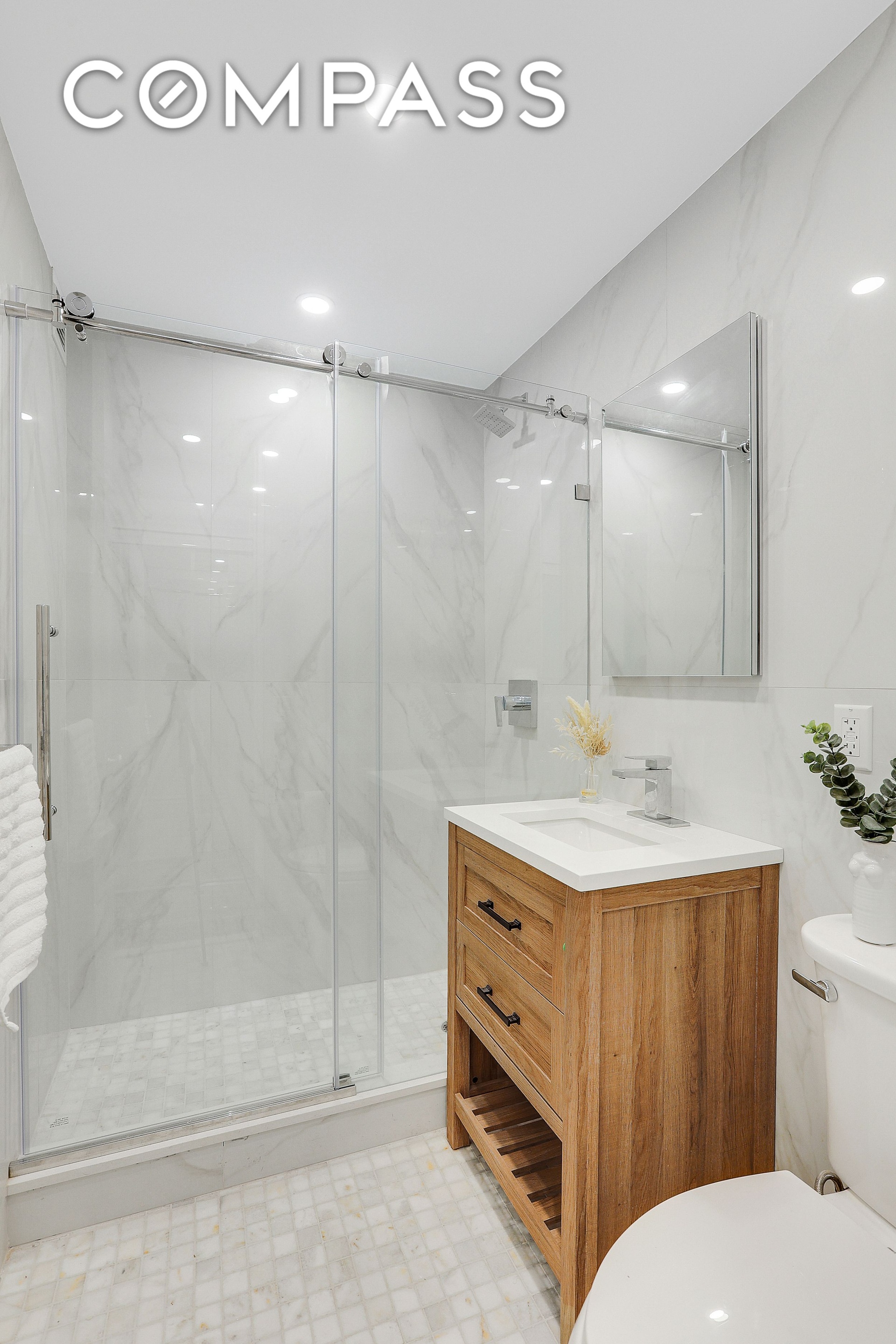 The spacious bedroom offers a walk-in closet, while the renovated bathroom adds a touch of spa-like luxury.