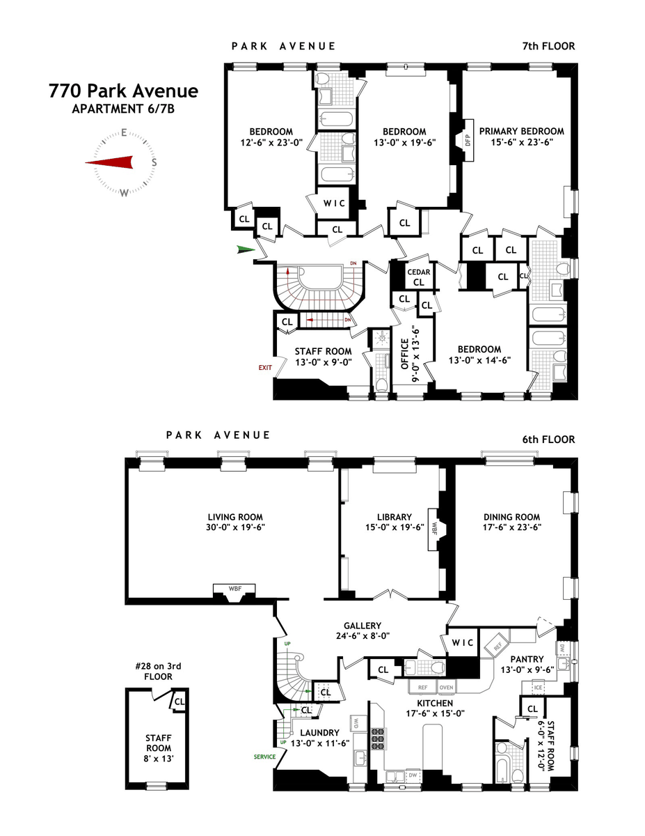 DescriptionThis grand and sophisticated duplex residence is located in the esteemed Rosario Candela-designed building at 770 Park Avenue in the heart of the Upper East Side. The apartment boasts a gracious layout with superb prewar details throughout. The entertaining rooms and three of the four bedrooms have an eastern exposure overlooking Park Avenue. Upon entering, you are greeted by an impressive entrance gallery with a sweeping curved staircase. The dramatic 30-foot living room with a wood-burning fireplace is sun-flooded through floor-to-ceiling windows with Juliet balconies. It is adjacent to the library with its own wood-burning fireplace and handsome built-in bookcases. The beautifully proportioned corner formal dining room is ideal for entertaining. The windowed gourmet eat-in kitchen offers custom cabinetry, ample countertops, two Subzero refrigerators, Viking 6-burner range, an additional oven, two sinks, two dishwashers and an icemaker. A staff room with full bath is conveniently located off the kitchen, as is a windowed laundry room that leads to the secondary staircase.