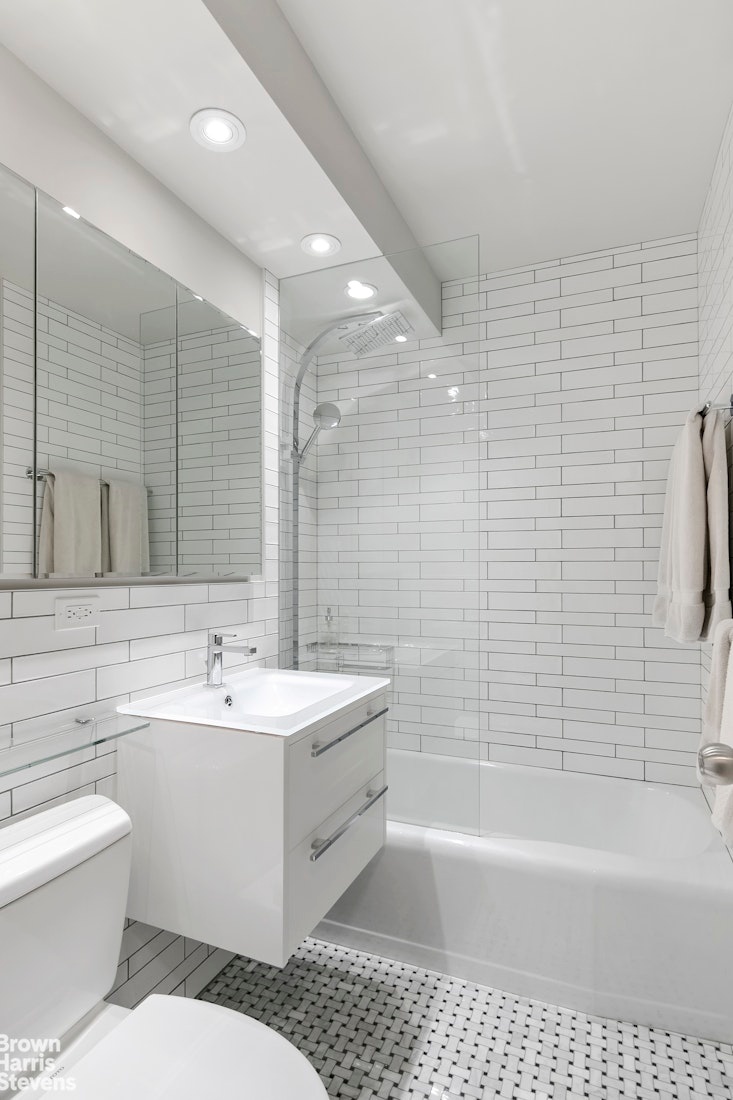 This newly renovated, move-in ready one-bedroom, with bright southern exposures is a rare find. Apartment features golden-toned wood floors, new customized ceiling lighting, new electrical, through-the-wall A/C units and an Electrolux washer/dryer. The generous-sized bedroom has two closets and easily accommodates a king-sized bed. The kitchen has sleek, modern cabinets, stainless steel appliances and Silestone counter tops. All five closets including a tremendous walk-in have custom shelving and lighting. The bathroom features basket-weave marble flooring, contemporary subway tiled walls a Toto toilet, rain shower with hand spay and a floating vanity.