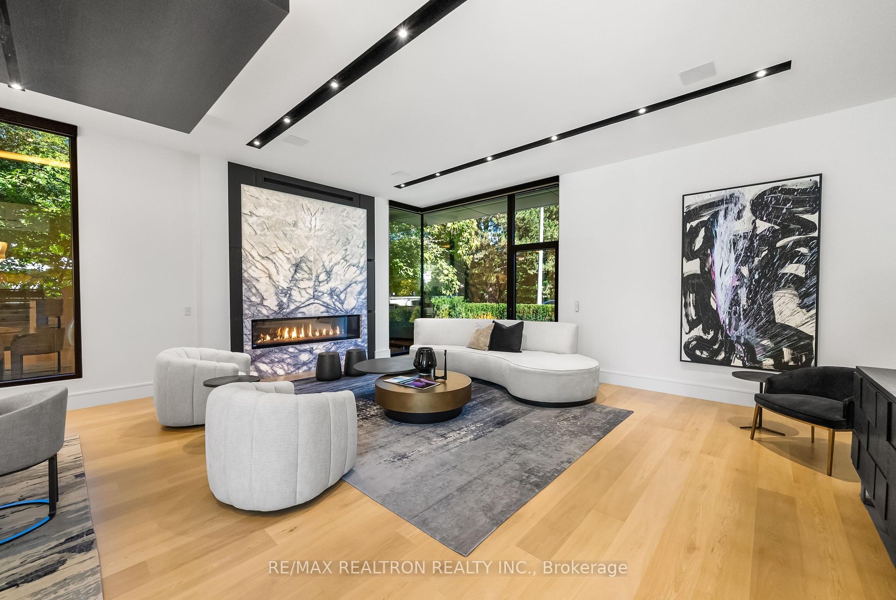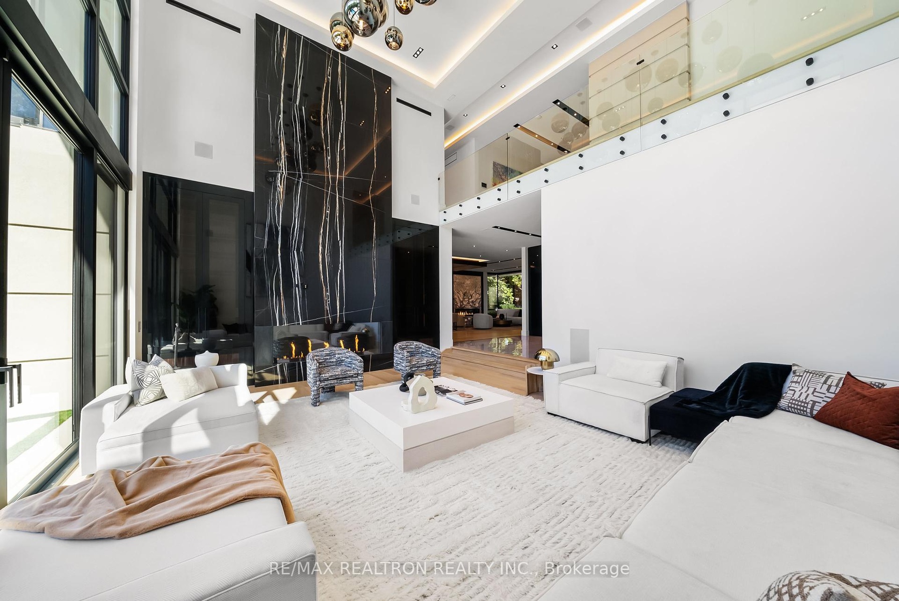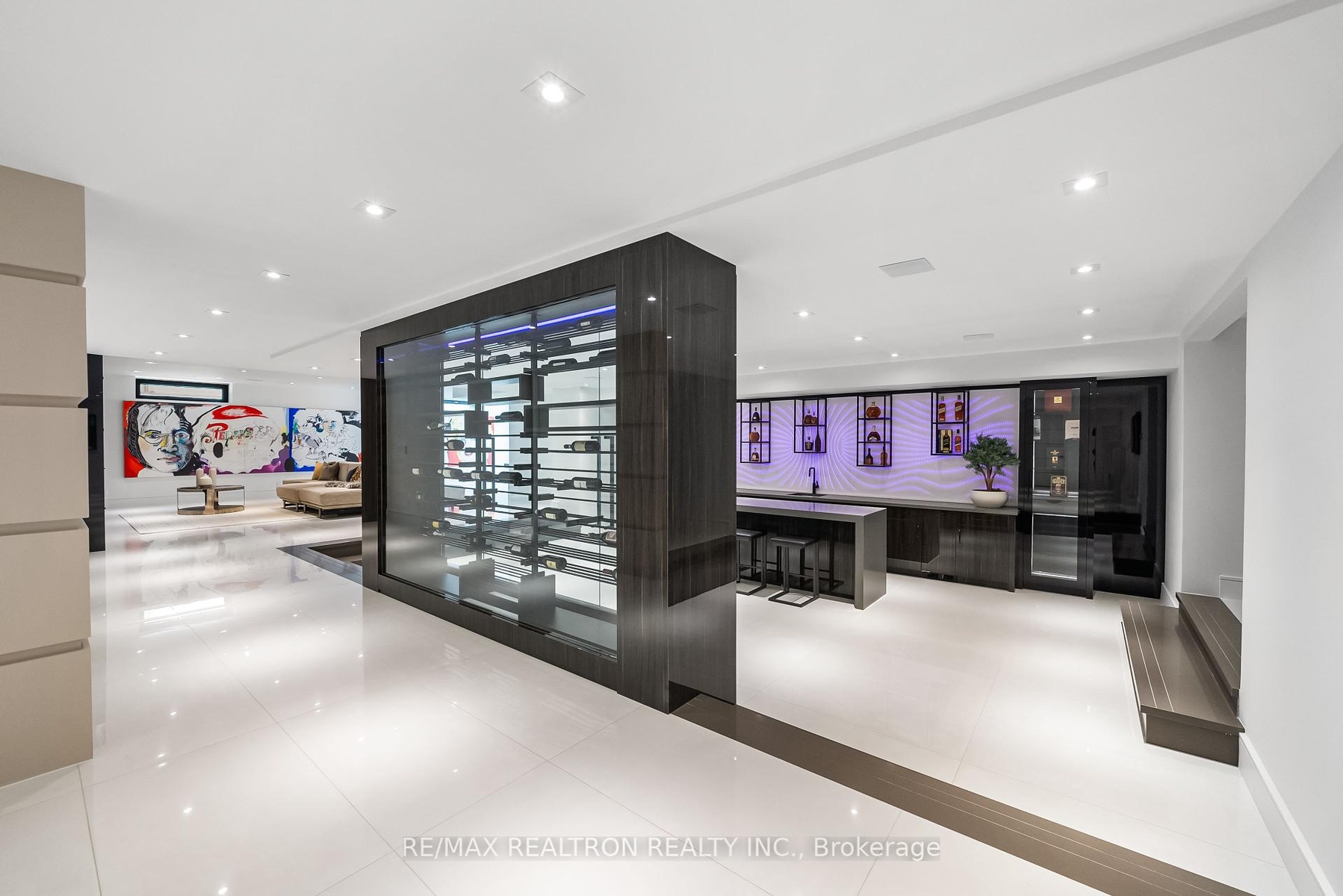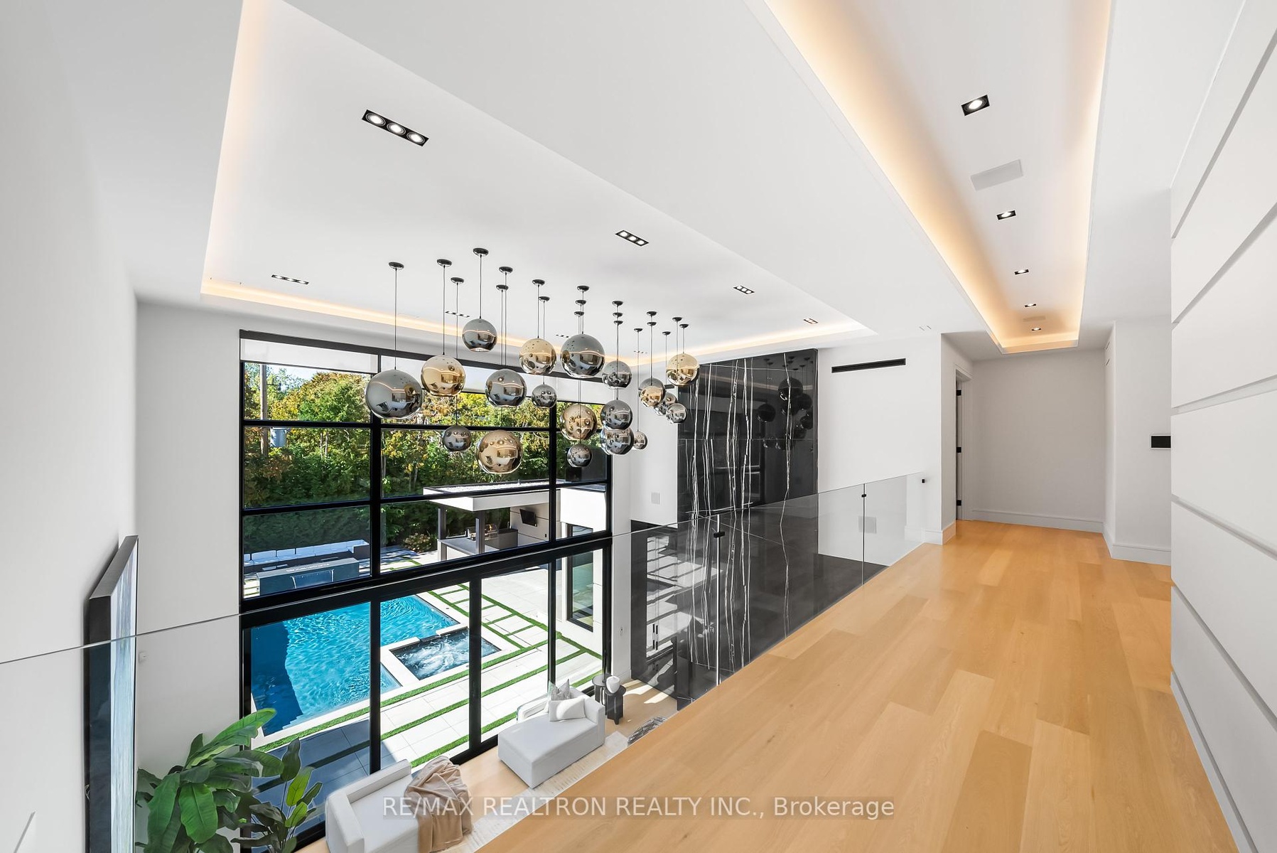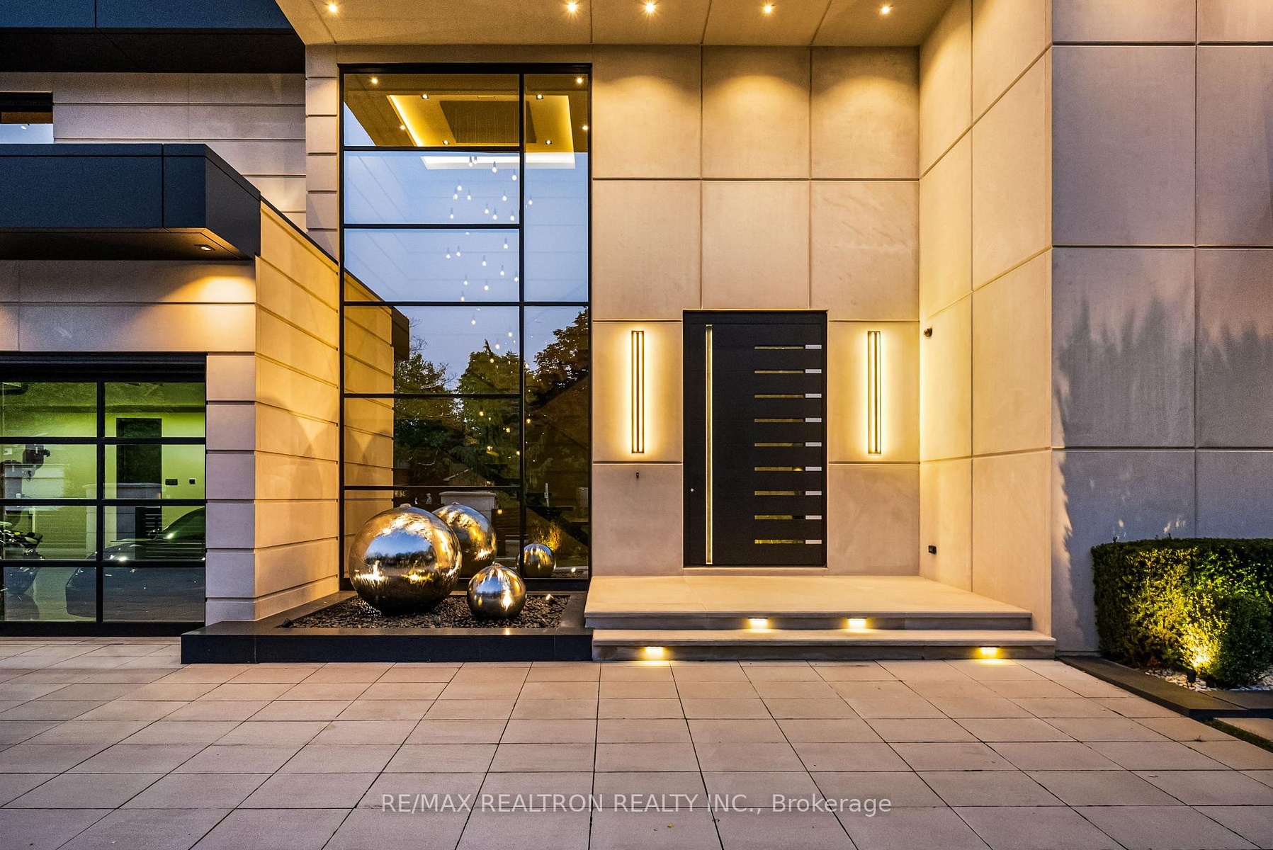 Gated Modern Masterpiece in Prestigious Bayview Glen. A striking showpiece in the exclusive Bayview Glen community, this estate is defined by bold design and uncompromising luxury. The exterior pairs Indiana limestone slabs with ACM panels, European aluminum tilt & slide windows, and a lifetime metal roof. Remote-access security gates and an 11-foot European pivot door create a dramatic first impression. Inside, soaring 24-foot ceilings define the family room, anchored by a marble fireplace and framed by floor-to-ceiling windows with integrated speakers. A floating glass staircase and elevator connect all three levels. Comfort is unmatched with heated main and lower levels, plus heated garages, driveway, steps, walkways, and pathways leading to the cabana. The chefs kitchen offers custom cabinetry, Thermador appliances, a Gaggenau wine cooler, and a waterfall island with leathered marble countertop, complemented by a full prep kitchen. The formal dining room is highlighted by an illuminated onyx wall and designer chandelier, while the living room boasts a backlit onyx fireplace as a dramatic focal point. The primary suite is a private sanctuary with boutique walk-in closet, balcony, fireplace, and spa-inspired ensuite with steam shower. In total, the home offers 5+1 bedrooms and 10 bathrooms. The entertainers lower level features a 26-foot bar with Mario Romano backsplash, 7.2 Dolby Atmos theatre with 150 screen and skylight, wine cellar, nanny suite, fitness room with steam sauna, and a spacious lounge with 100 fireplace and walk-up to yard. Outdoors, southwest exposure frames a resort setting: a Todd saltwater pool, Jacuzzi with independent controls, cascading waterfall with gas fireplace and heated pathways. The cabana doubles as an outdoor kitchen with barbecue, fridge, cabinetry, outdoor TV, shower, 2-piece bath, and built-in speakers. An LA-inspired showpiece in Bayview Glen, blending contemporary design with world-class finishes.
