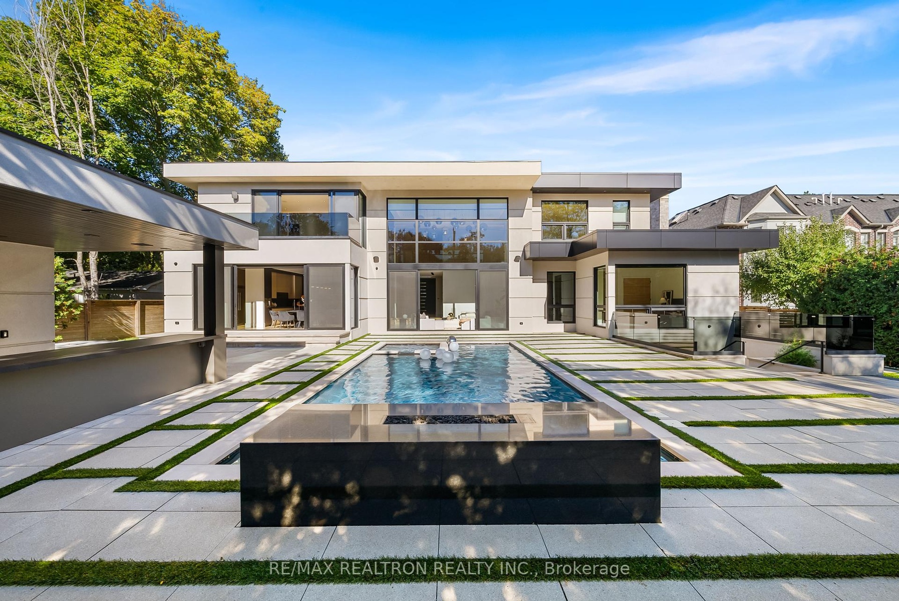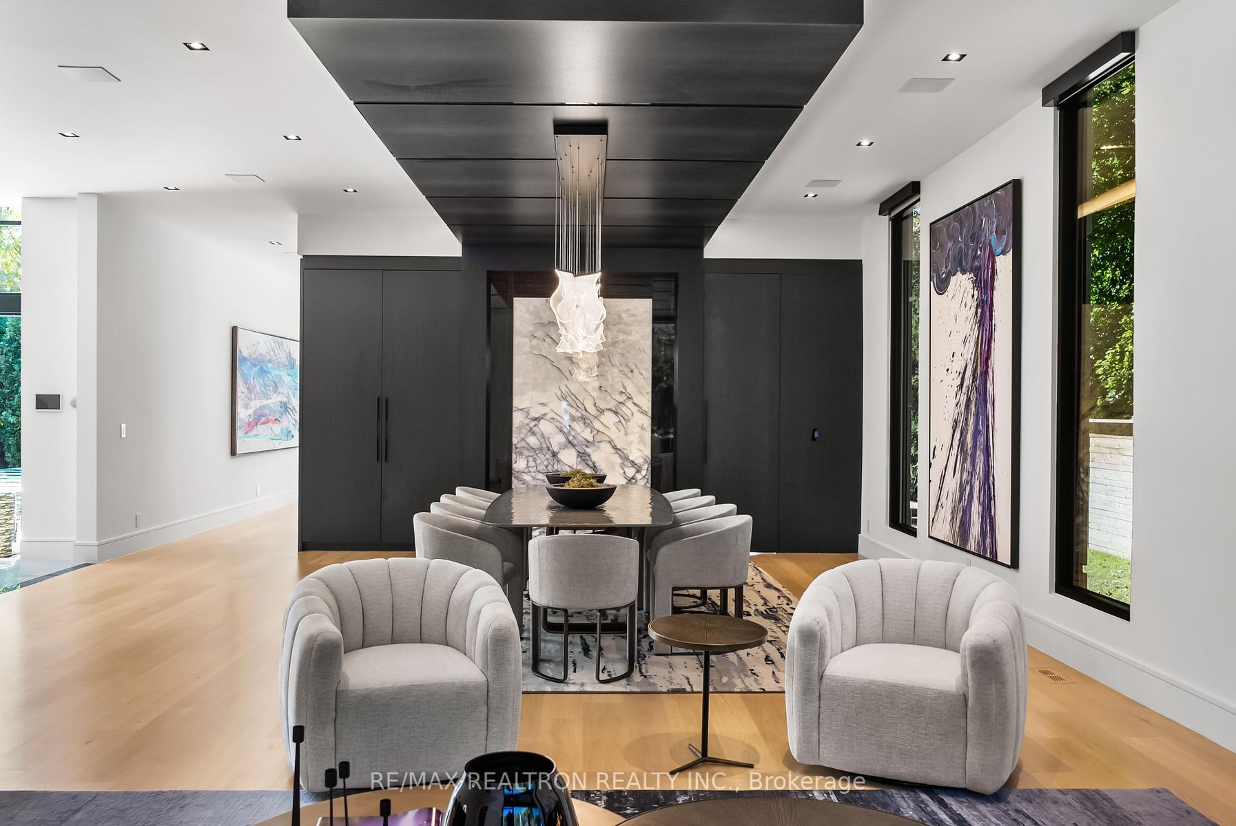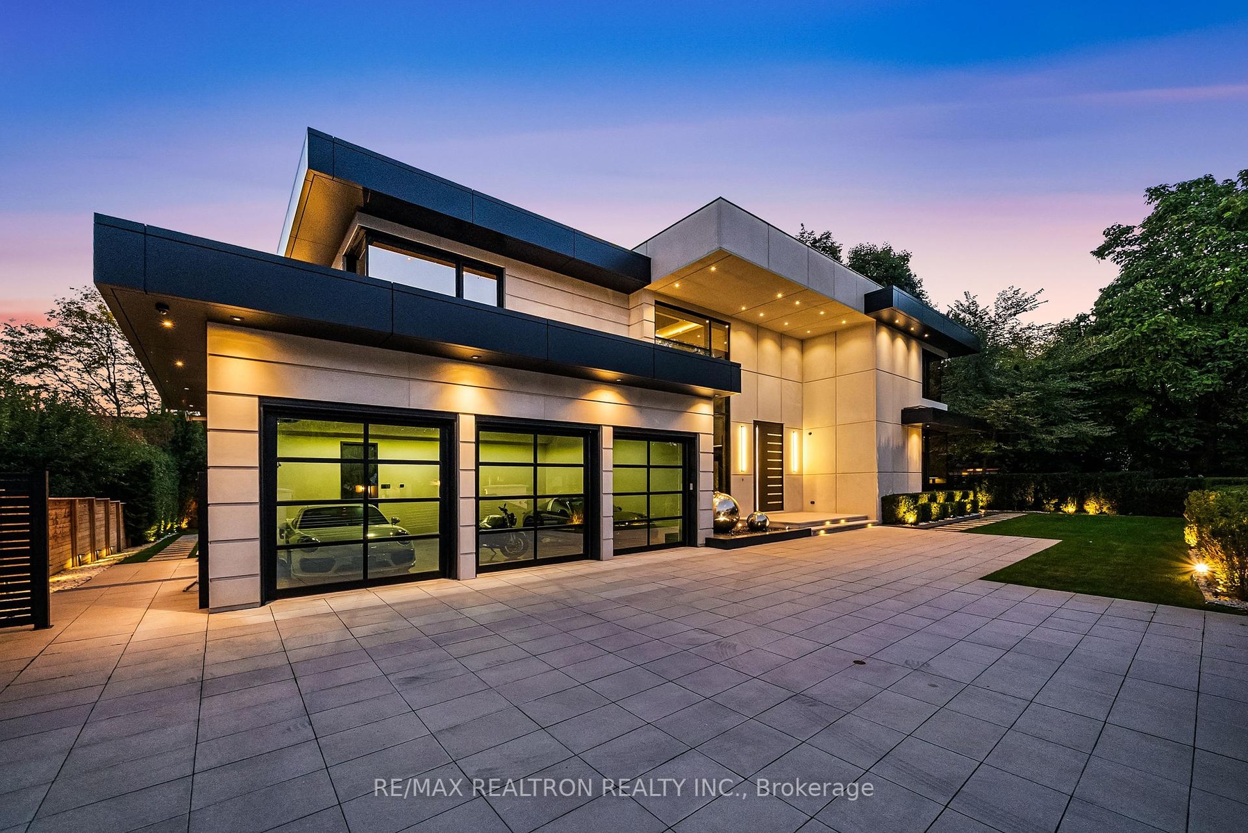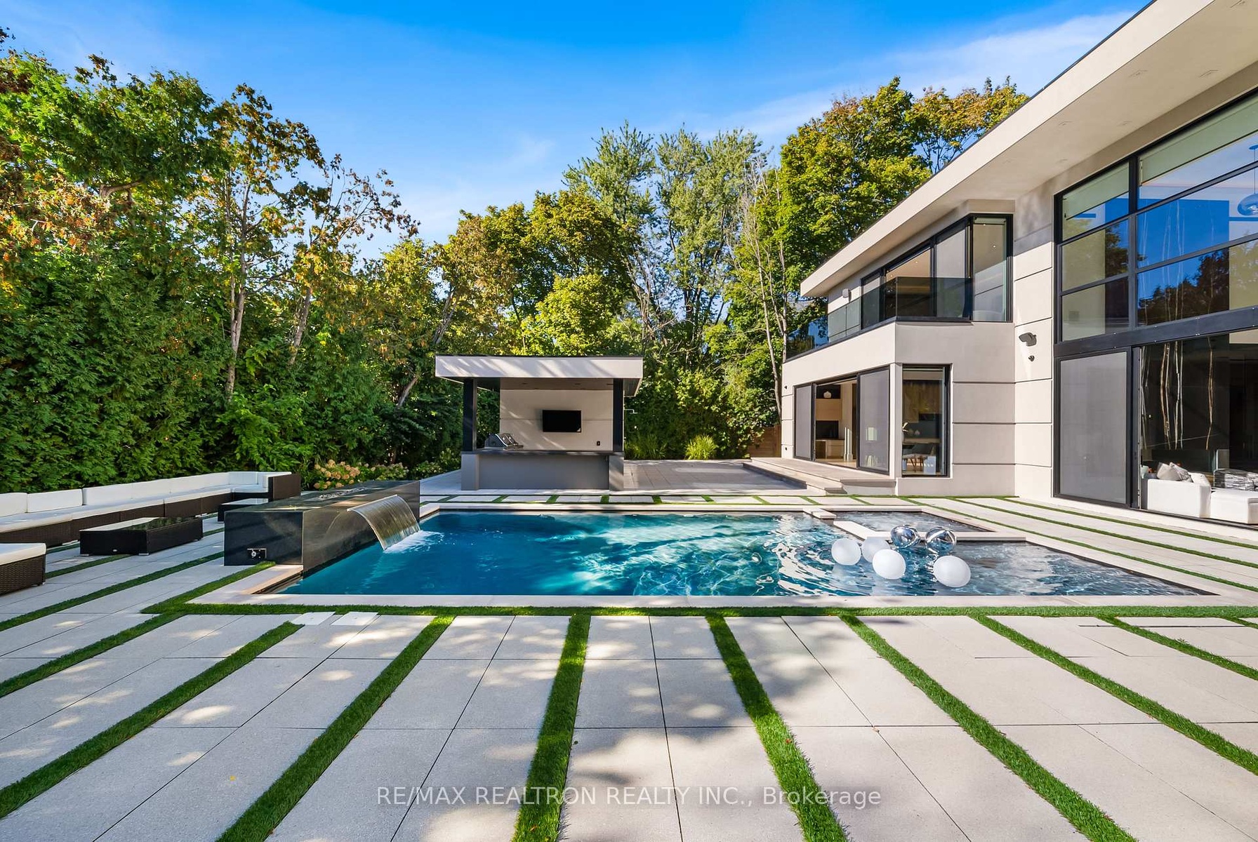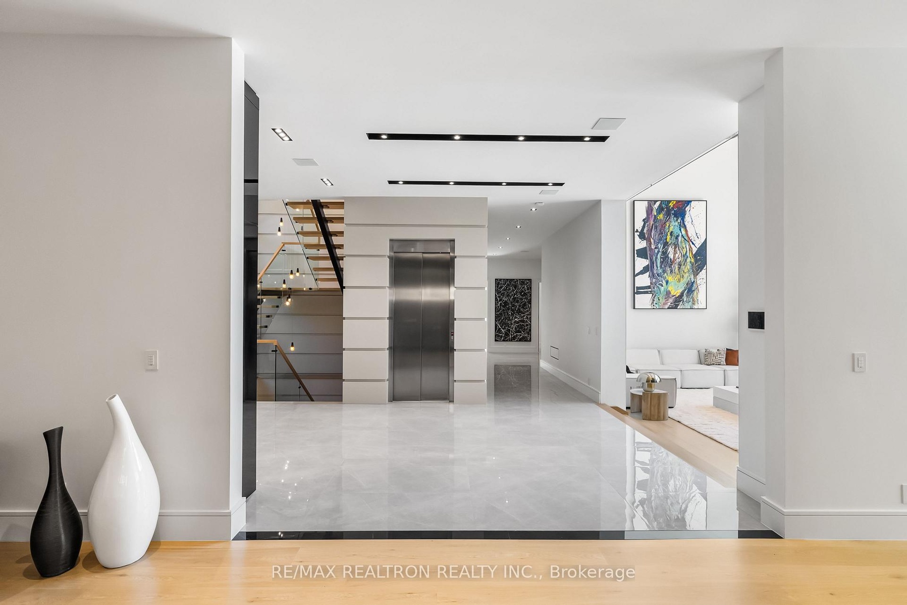 Gated Modern Masterpiece in Prestigious Bayview Glen. A striking showpiece in the exclusive Bayview Glen community, this estate is defined by bold design and uncompromising luxury. The exterior pairs Indiana limestone slabs with ACM panels, European aluminum tilt & slide windows, and a lifetime metal roof. Remote-access security gates and an 11-foot European pivot door create a dramatic first impression. Inside, soaring 24-foot ceilings define the family room, anchored by a marble fireplace and framed by floor-to-ceiling windows with integrated speakers. A floating glass staircase and elevator connect all three levels. Comfort is unmatched with heated main and lower levels, plus heated garages, driveway, steps, walkways, and pathways leading to the cabana. The chefs kitchen offers custom cabinetry, Thermador appliances, a Gaggenau wine cooler, and a waterfall island with leathered marble countertop, complemented by a full prep kitchen. The formal dining room is highlighted by an illuminated onyx wall and designer chandelier, while the living room boasts a backlit onyx fireplace as a dramatic focal point. The primary suite is a private sanctuary with boutique walk-in closet, balcony, fireplace, and spa-inspired ensuite with steam shower. In total, the home offers 5+1 bedrooms and 10 bathrooms. The entertainers lower level features a 26-foot bar with Mario Romano backsplash, 7.2 Dolby Atmos theatre with 150 screen and skylight, wine cellar, nanny suite, fitness room with steam sauna, and a spacious lounge with 100 fireplace and walk-up to yard. Outdoors, southwest exposure frames a resort setting: a Todd saltwater pool, Jacuzzi with independent controls, cascading waterfall with gas fireplace and heated pathways. The cabana doubles as an outdoor kitchen with barbecue, fridge, cabinetry, outdoor TV, shower, 2-piece bath, and built-in speakers. An LA-inspired showpiece in Bayview Glen, blending contemporary design with world-class finishes.
