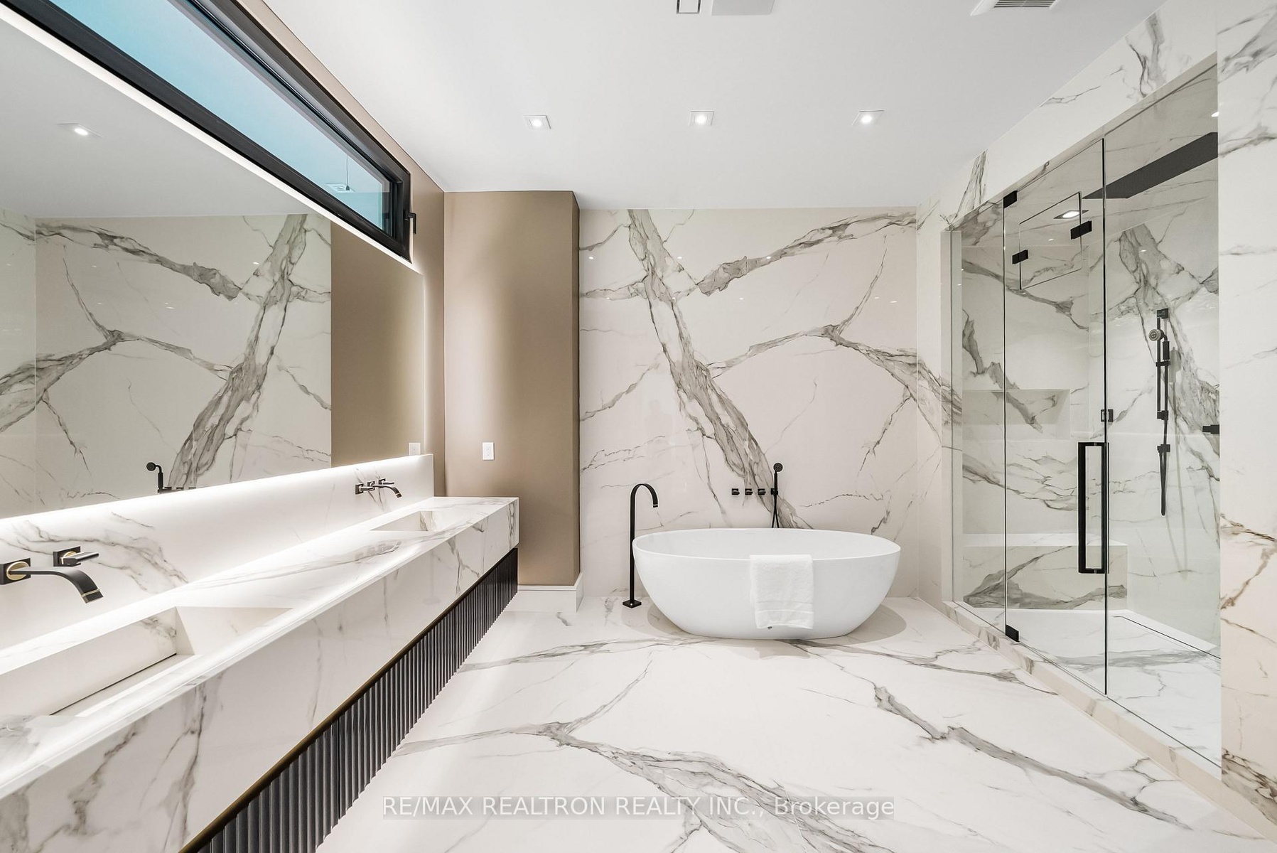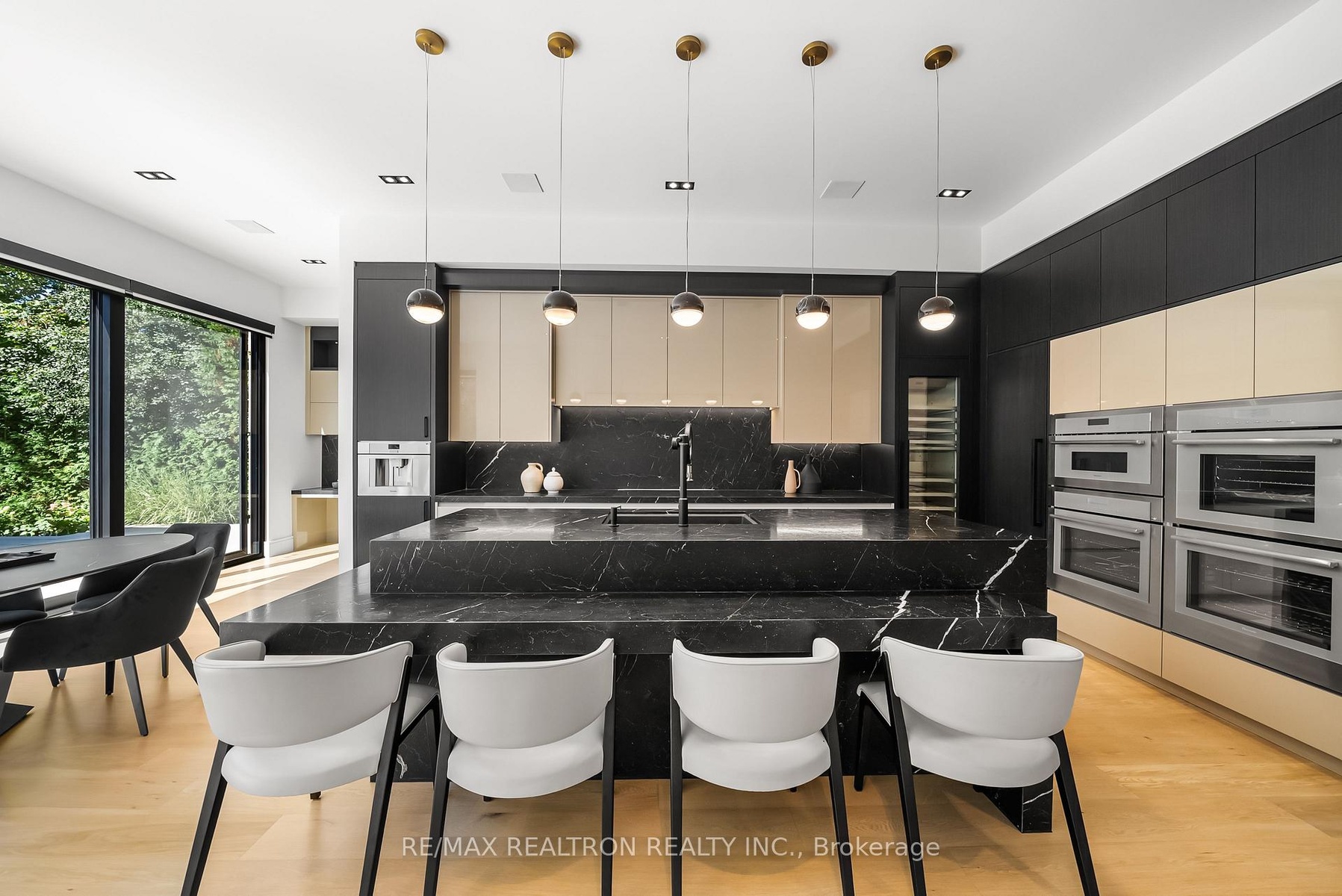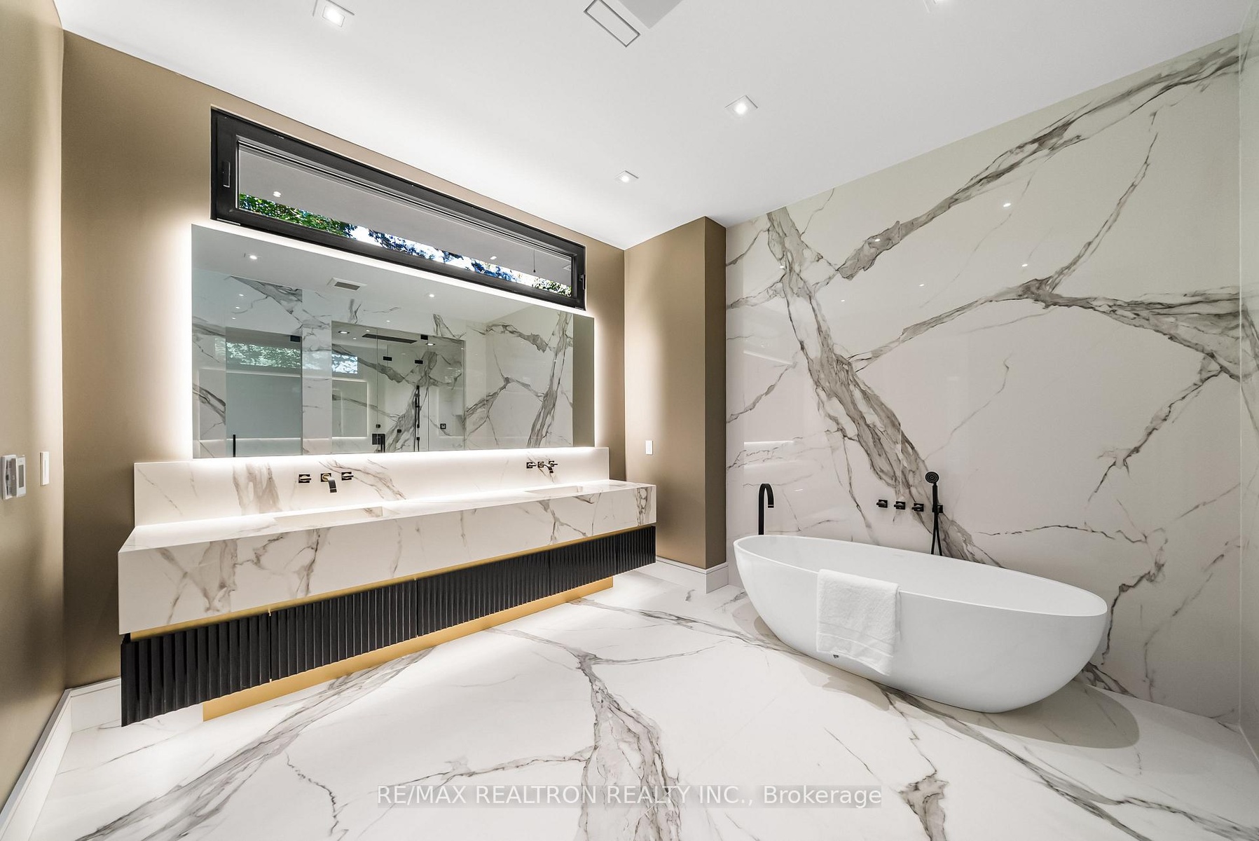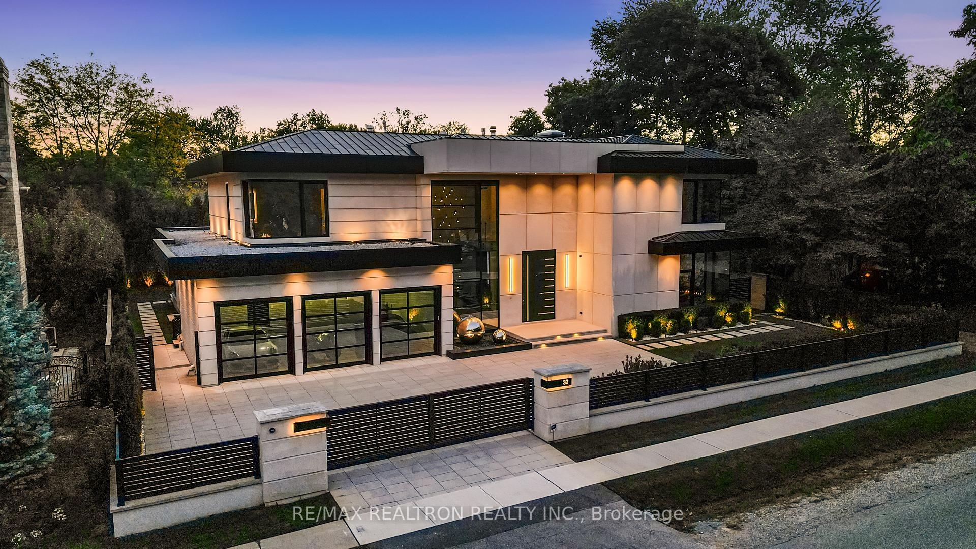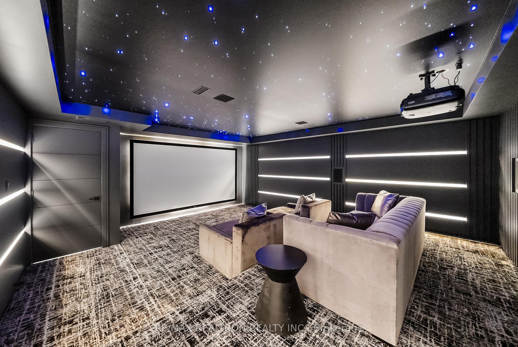 Gated Modern Masterpiece in Prestigious Bayview Glen. A striking showpiece in the exclusive Bayview Glen community, this estate is defined by bold design and uncompromising luxury. The exterior pairs Indiana limestone slabs with ACM panels, European aluminum tilt & slide windows, and a lifetime metal roof. Remote-access security gates and an 11-foot European pivot door create a dramatic first impression. Inside, soaring 24-foot ceilings define the family room, anchored by a marble fireplace and framed by floor-to-ceiling windows with integrated speakers. A floating glass staircase and elevator connect all three levels. Comfort is unmatched with heated main and lower levels, plus heated garages, driveway, steps, walkways, and pathways leading to the cabana. The chefs kitchen offers custom cabinetry, Thermador appliances, a Gaggenau wine cooler, and a waterfall island with leathered marble countertop, complemented by a full prep kitchen. The formal dining room is highlighted by an illuminated onyx wall and designer chandelier, while the living room boasts a backlit onyx fireplace as a dramatic focal point. The primary suite is a private sanctuary with boutique walk-in closet, balcony, fireplace, and spa-inspired ensuite with steam shower. In total, the home offers 5+1 bedrooms and 10 bathrooms. The entertainers lower level features a 26-foot bar with Mario Romano backsplash, 7.2 Dolby Atmos theatre with 150 screen and skylight, wine cellar, nanny suite, fitness room with steam sauna, and a spacious lounge with 100 fireplace and walk-up to yard. Outdoors, southwest exposure frames a resort setting: a Todd saltwater pool, Jacuzzi with independent controls, cascading waterfall with gas fireplace and heated pathways. The cabana doubles as an outdoor kitchen with barbecue, fridge, cabinetry, outdoor TV, shower, 2-piece bath, and built-in speakers. An LA-inspired showpiece in Bayview Glen, blending contemporary design with world-class finishes.