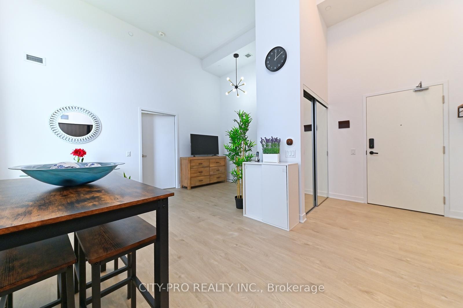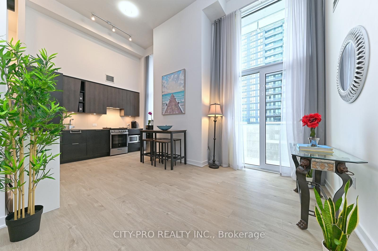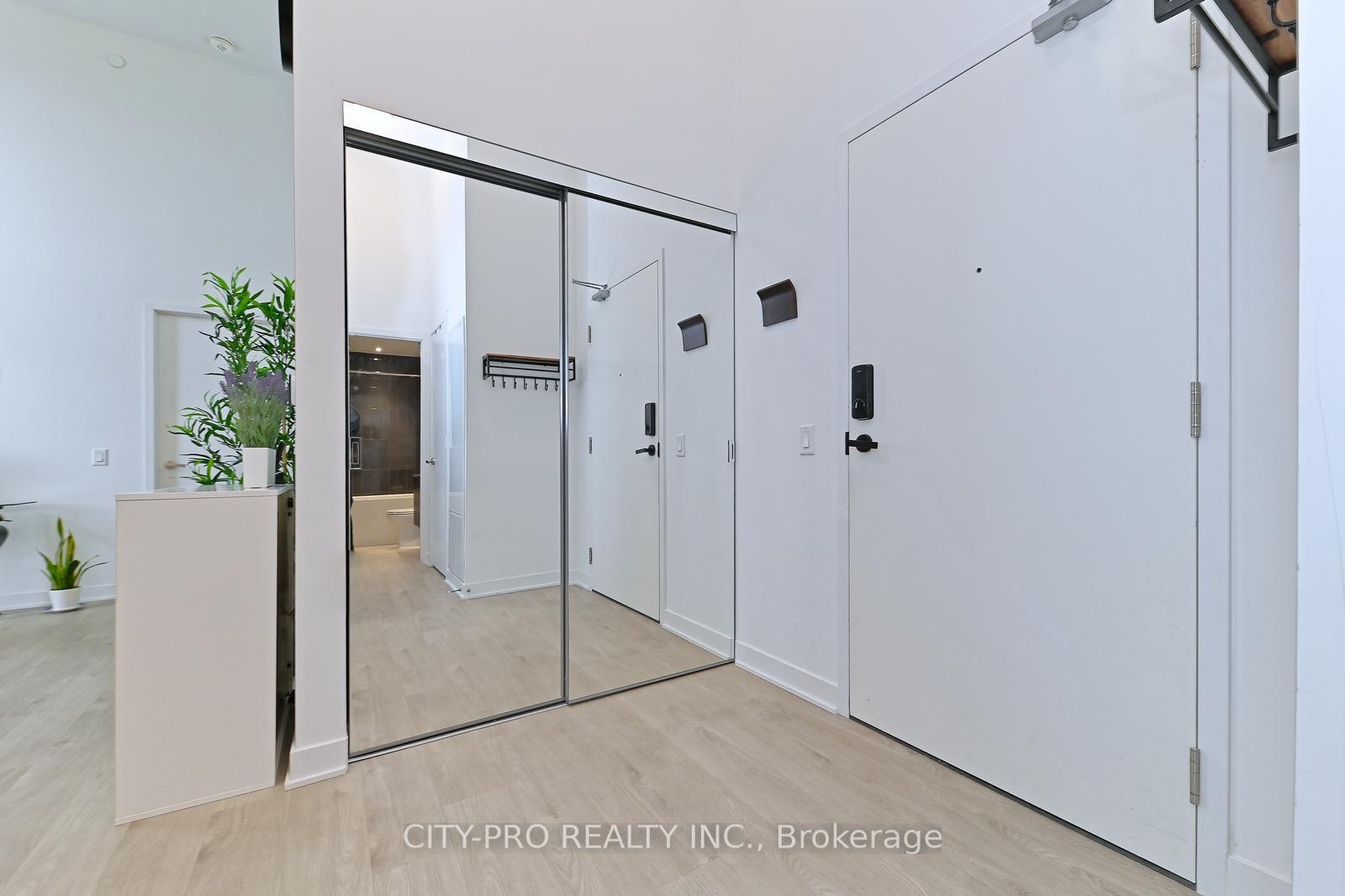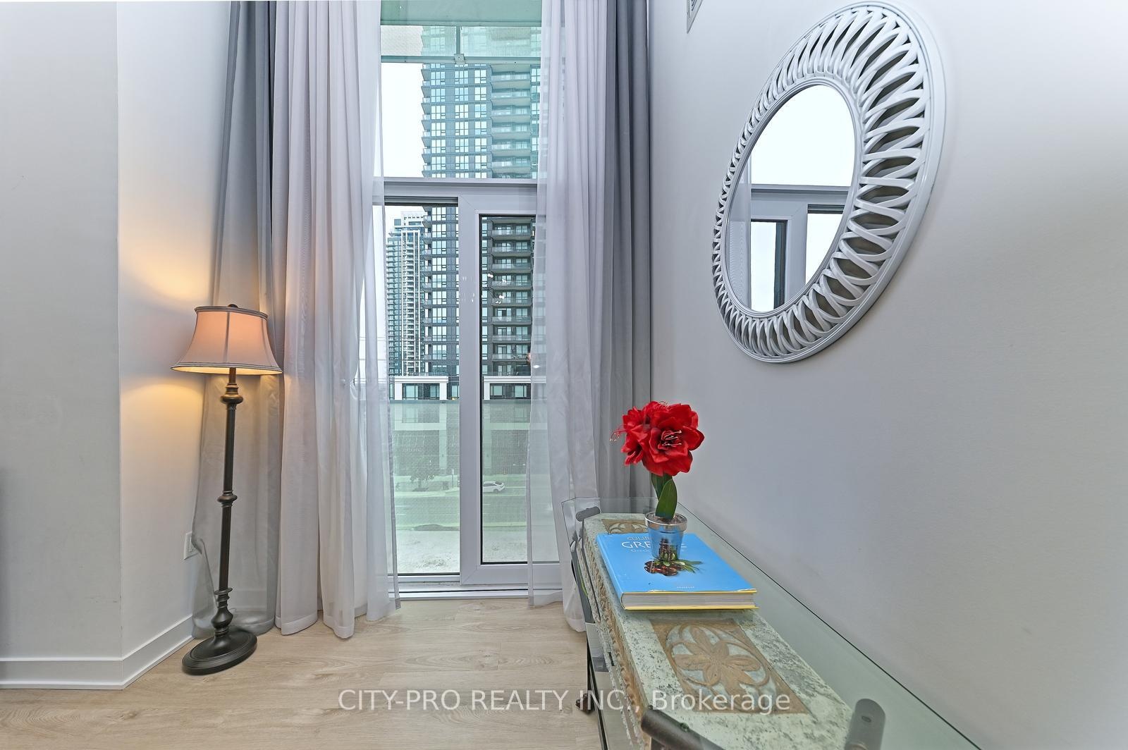 Discover urban luxury in this stunning M City 1 residence. This two-bedroom, two-bathroom + Den Condo is defined by its dramatic 14-foot ceilings and floor-to-ceiling windows that flood the space with light. The expansive, 296 sq. ft. wrap-around balcony, accessible from both the living area and bedrooms, offers breathtaking city views. The modern kitchen is equipped with integrated appliances and boasts beautifully crafted custom cabinets. The interior is thoughtfully appointed with mirrored sliding closet doors in the master suite, second bedroom, and hallway. The unit is complete with roller blinds in the bedrooms, and elegant draperies throughout the living and dining areas for a finished, move-in-ready feel.