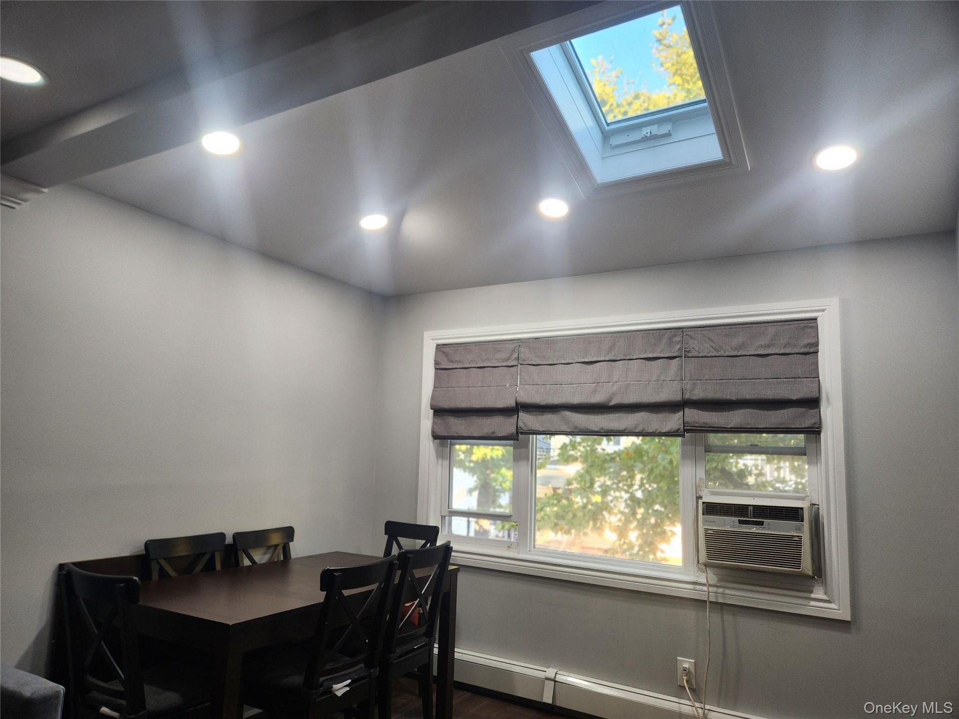 - Dining space featuring recessed lighting, dark wood-style flooring, baseboard heating, cooling unit, and a skylight