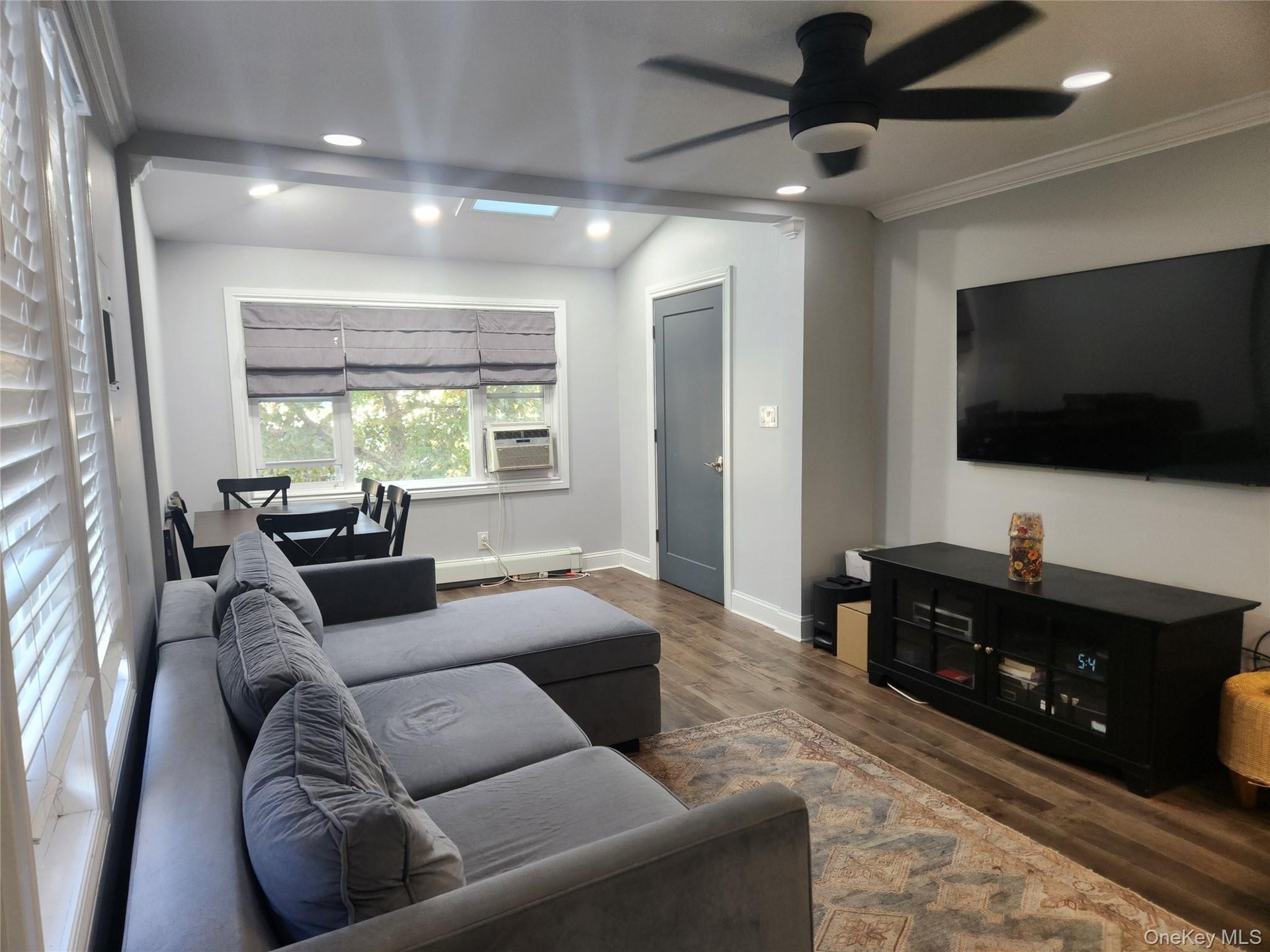 - Living area with ornamental molding, a ceiling fan, wood finished floors, recessed lighting, and a baseboard heating unit