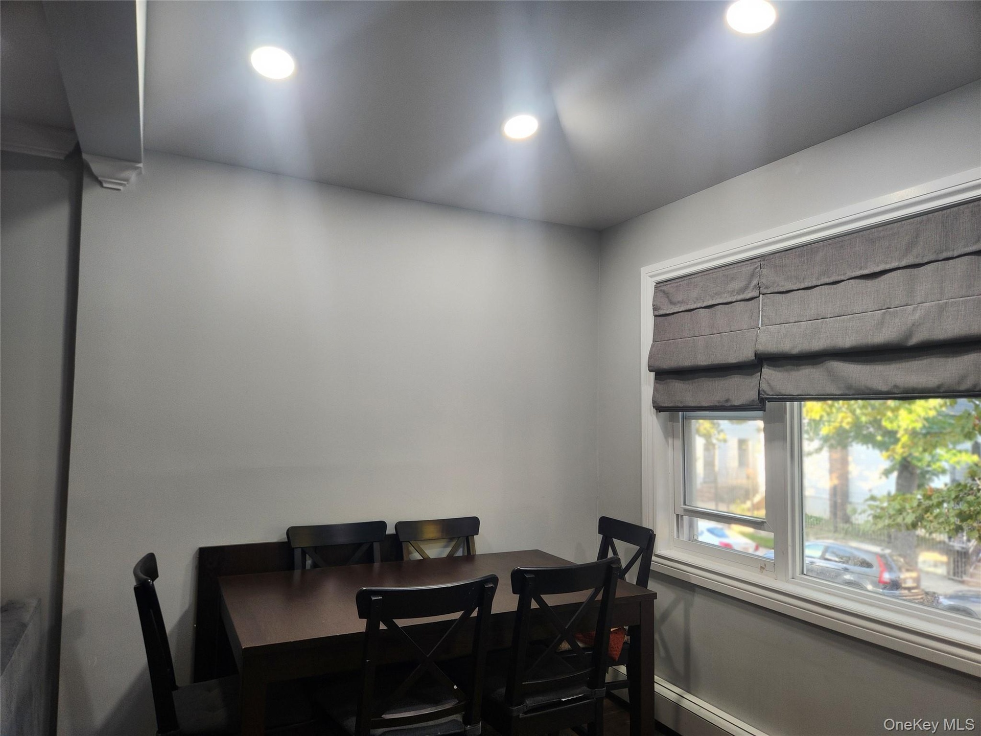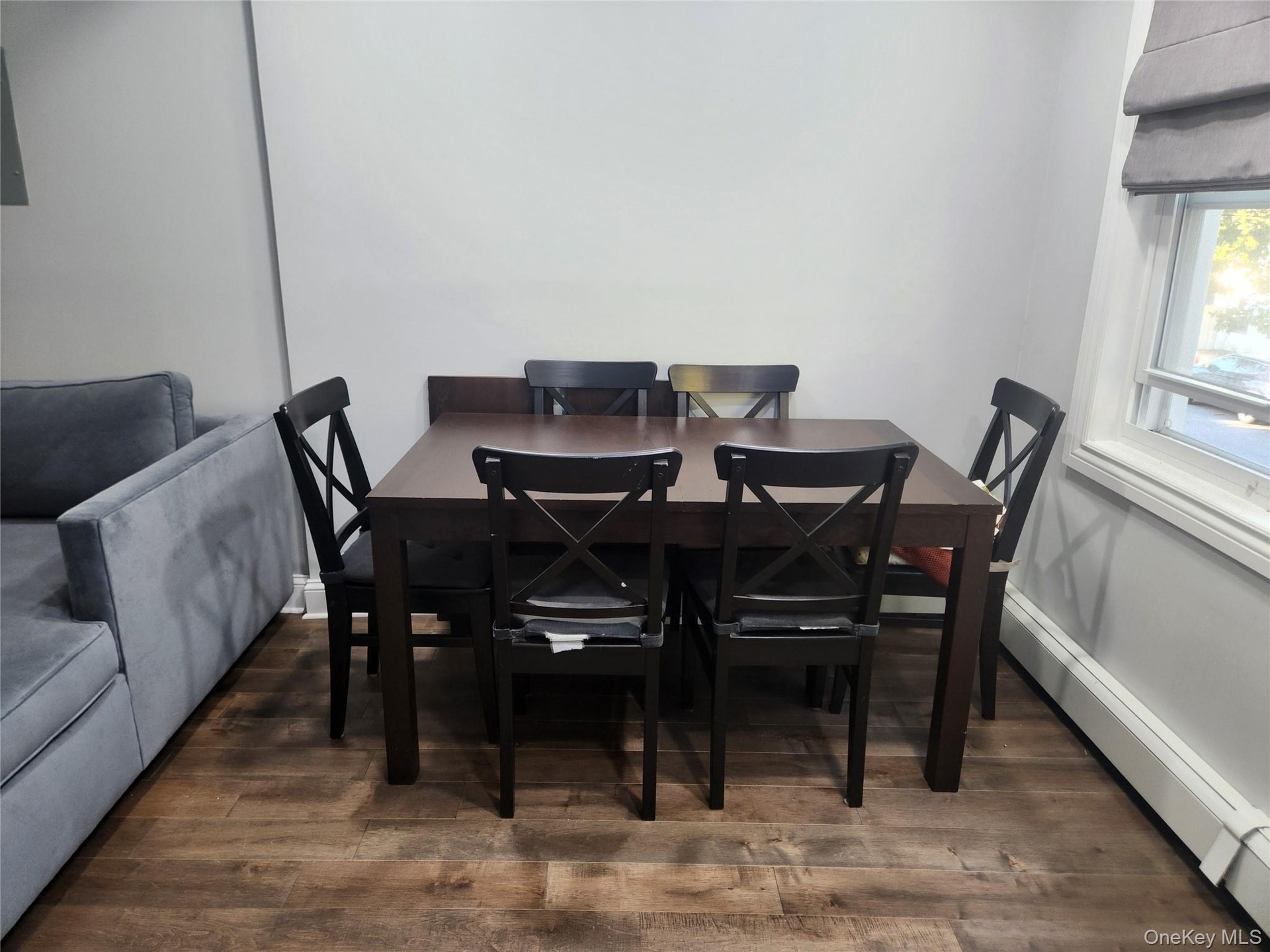 - Dining area featuring a baseboard radiator and dark wood finished floors