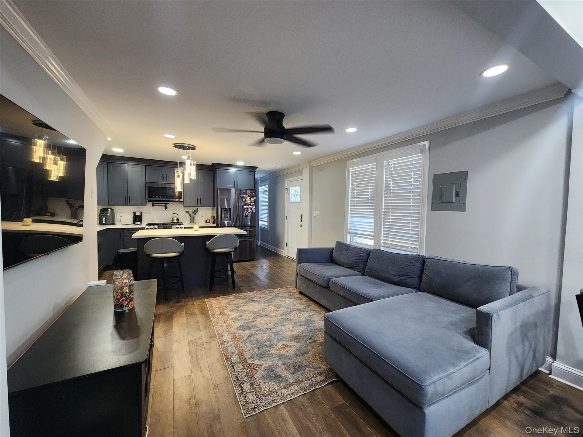 - Living room featuring crown molding, dark wood finished floors, recessed lighting, a ceiling fan, and electric panel