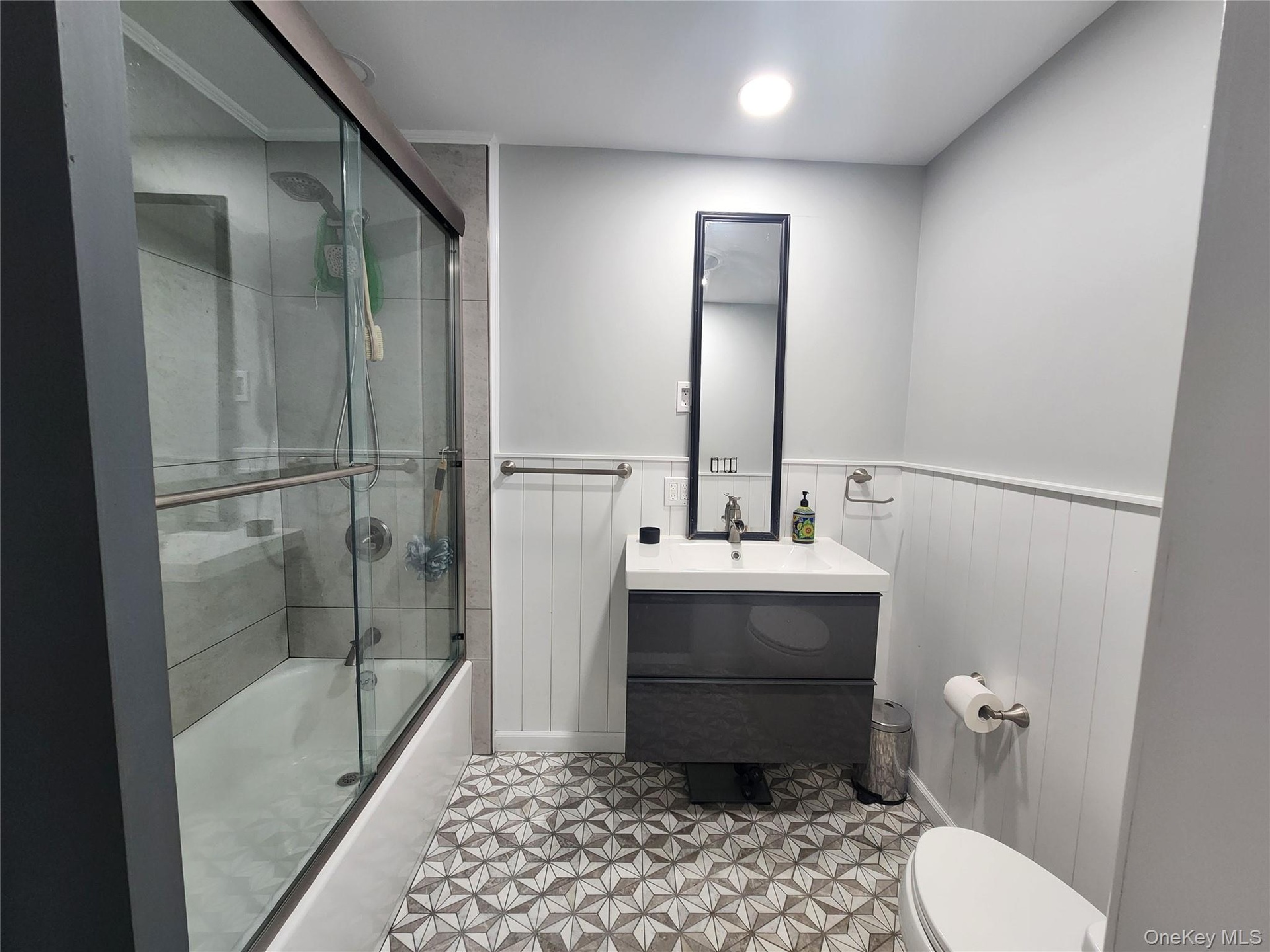 - Full bathroom featuring combined bath / shower with glass door, vanity, a wainscoted wall, and light tile patterned flooring