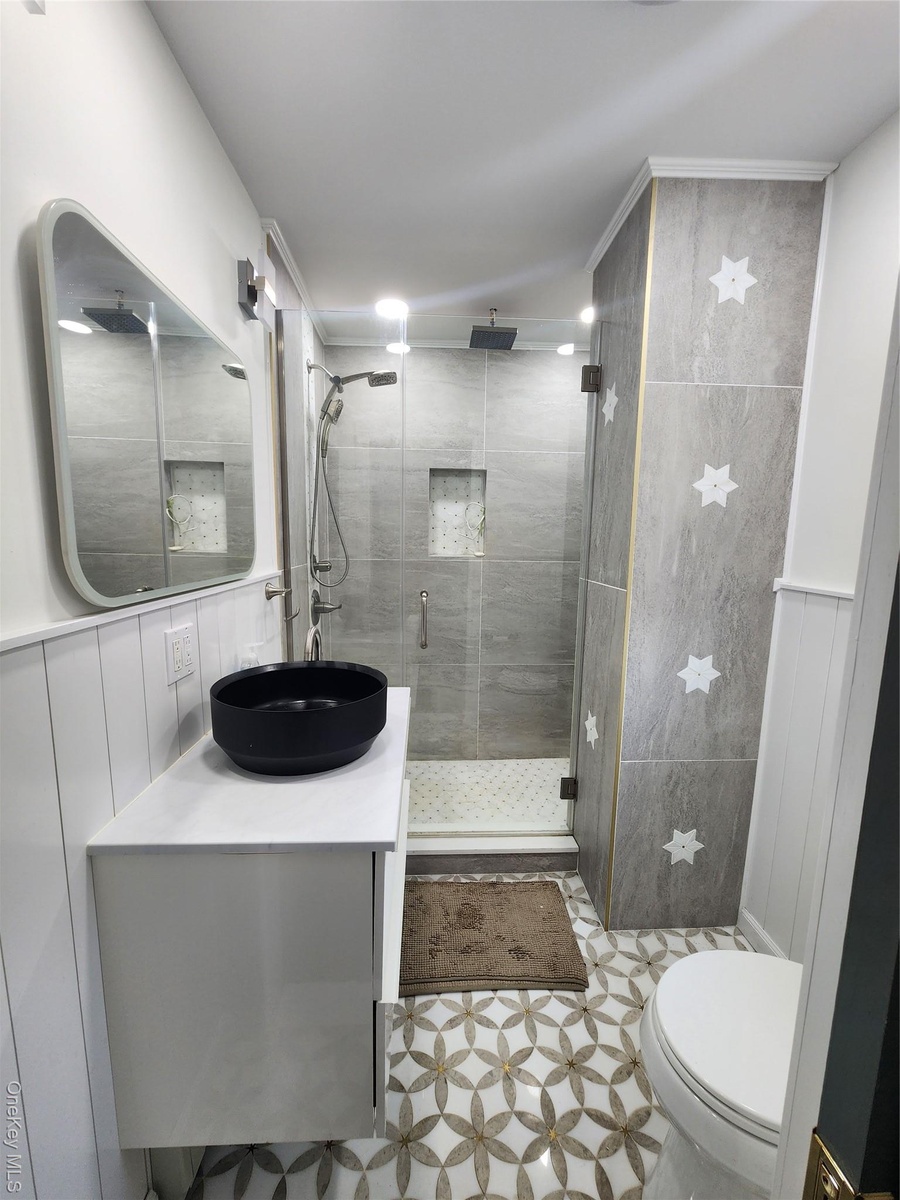 - Full bathroom with vanity, a shower stall, and a wainscoted wall