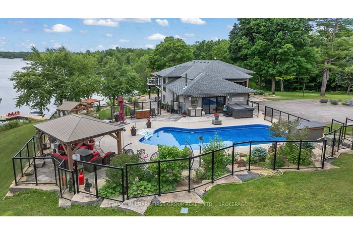 DescriptionWelcome to Casa Pinot, a breathtakingly reimagined waterfront estate nestled on Black Lake, showcasing 377 feet of natural shoreline and 2.5 acres of professionally landscaped privacy. This custom-designed and extensively renovated home offers nearly 4,000 sq ft of luxurious living space across multiple levels, blending timeless design with exceptional functionality. Step into a dramatic entry leading to a great room with soaring ceilings, heated flooring, and a striking floating staircase, all framed by expansive windows that flood the space with natural light. The open-concept kitchen is a perfect balance of style and performance, flowing effortlessly into spacious dining and living areas with beautiful panoramic lake views. Walkout to the patio overlooking a private resort-style setting. Outdoors, enjoy a heated inground pool, hot tub, firepit lounge, and a charming lakeside bunkie for guests or quiet retreat. Expansive windows in the family room overlook the landscaped pool area with extensive patio and seating areas. The main-level primary suite offers a spa-inspired ensuite with a soaking tub and walk-in closet. A second bedroom and full bath accommodate guests in comfort. The bright, walk-out lower level includes two additional bedrooms, full bath, home office, gym area, family room, and large laundry space. An oversized garage/workshop provides ample storage. Whether you're a full-time resident, seasonal owner, or remote professional seeking sanctuary with style, this home offers the flexibility and infrastructure to support your lifestyle goals. With over $1.1 million in renovations you can only appreciate the beauty in person. Located minutes from Perth, yet worlds away this is the legacy estate you've been waiting for.Amenities- Air Exchanger
