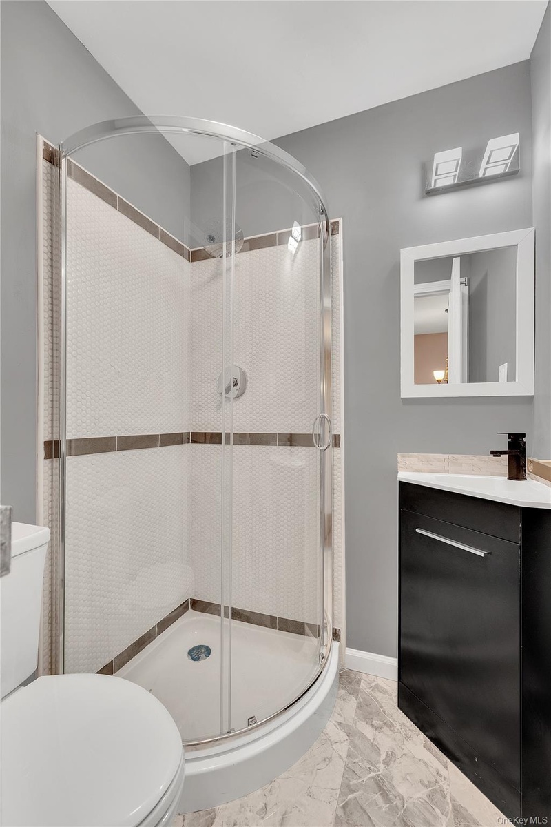 - Bathroom with vanity, a shower stall, and light marble finish floors
