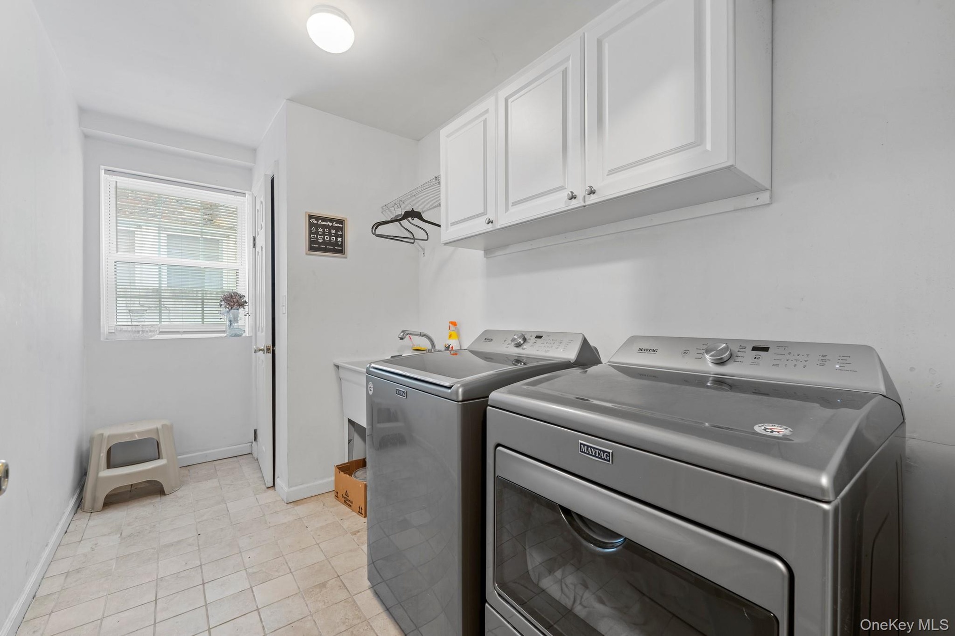 - Laundry area with light tile patterned flooring, cabinet space, and separate washer and dryer
