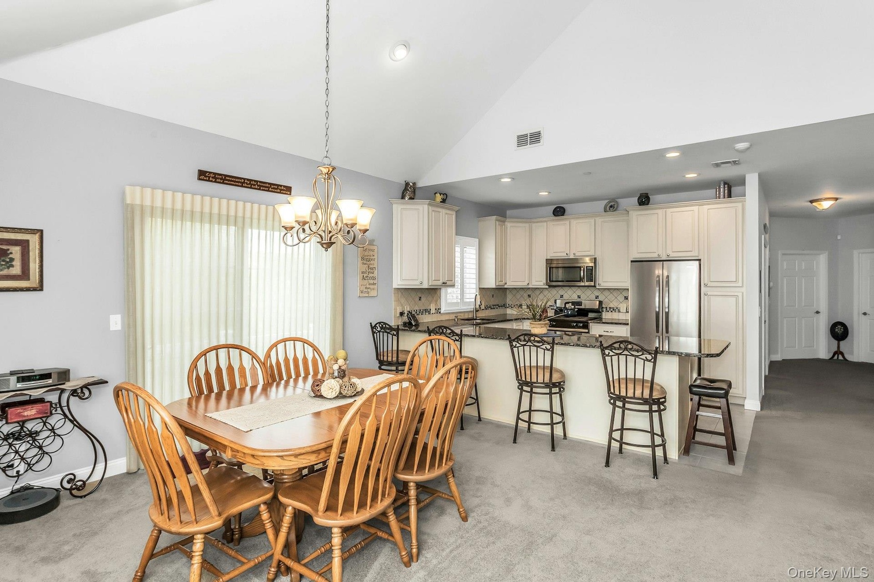 - Dining area featuring light colored carpet, vaulted ceiling, and a chandelier