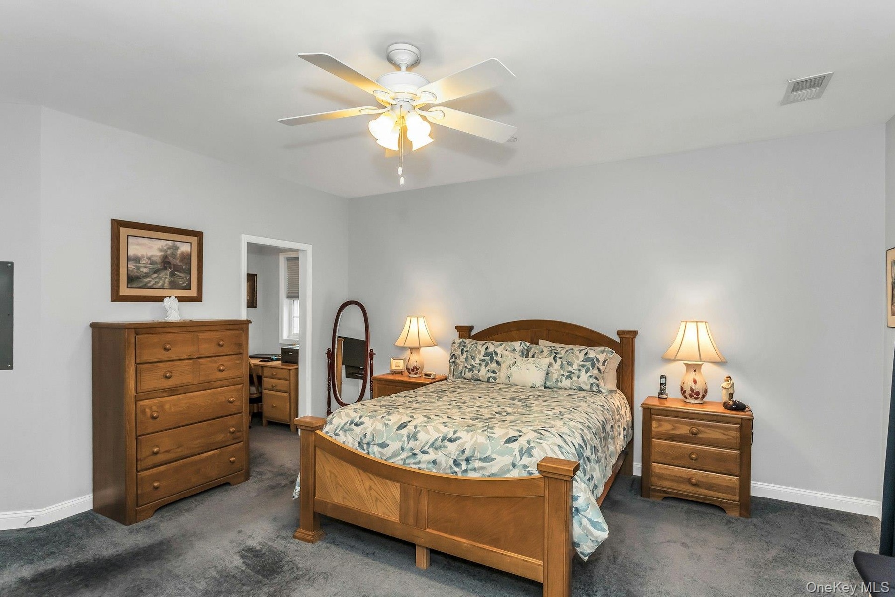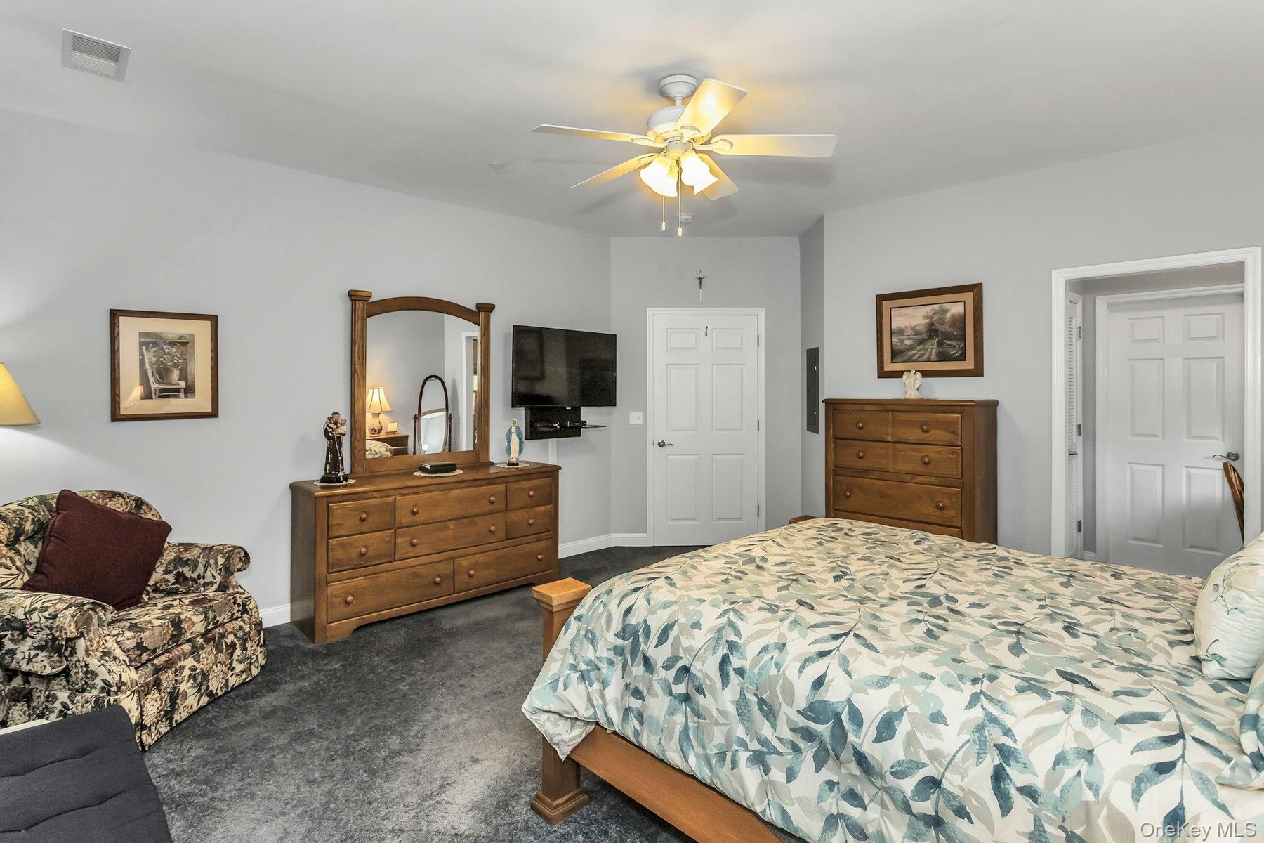 - Bedroom with dark colored carpet, ceiling fan, and ensuite bath