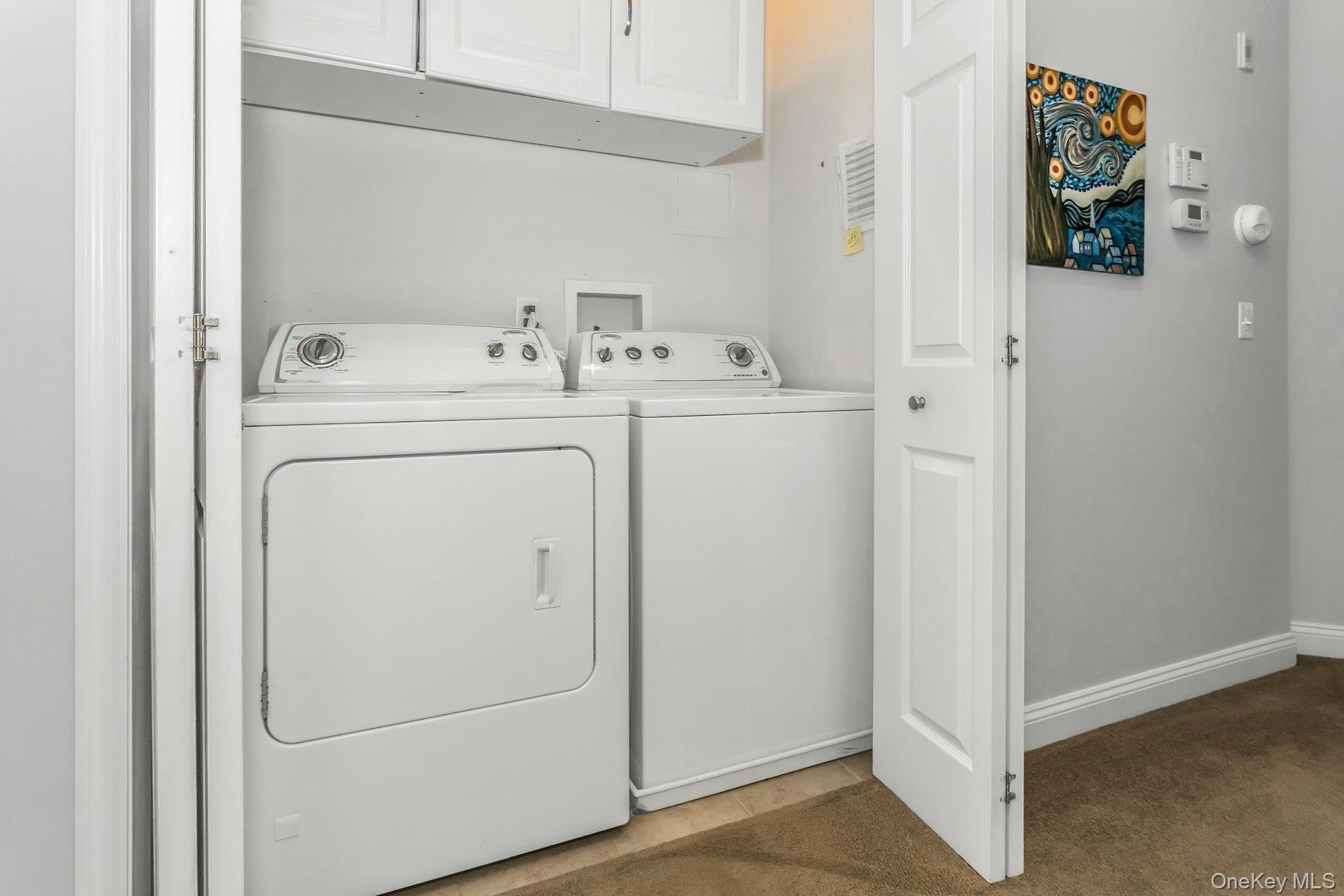 - Washroom featuring independent washer and dryer, cabinet space, and carpet floors