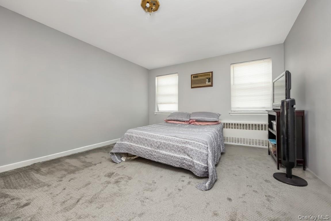 - Bedroom featuring light carpet, radiator heating unit, and a wall mounted air conditioner