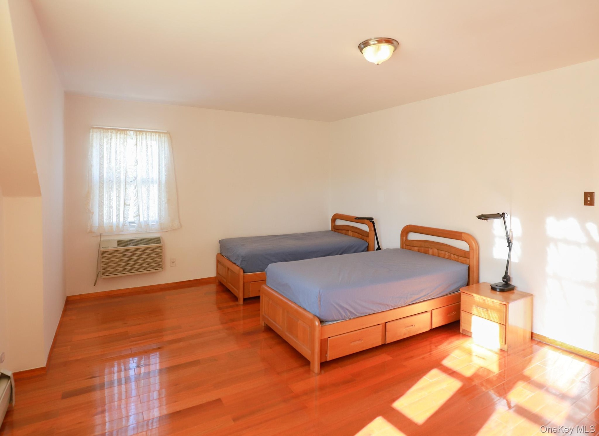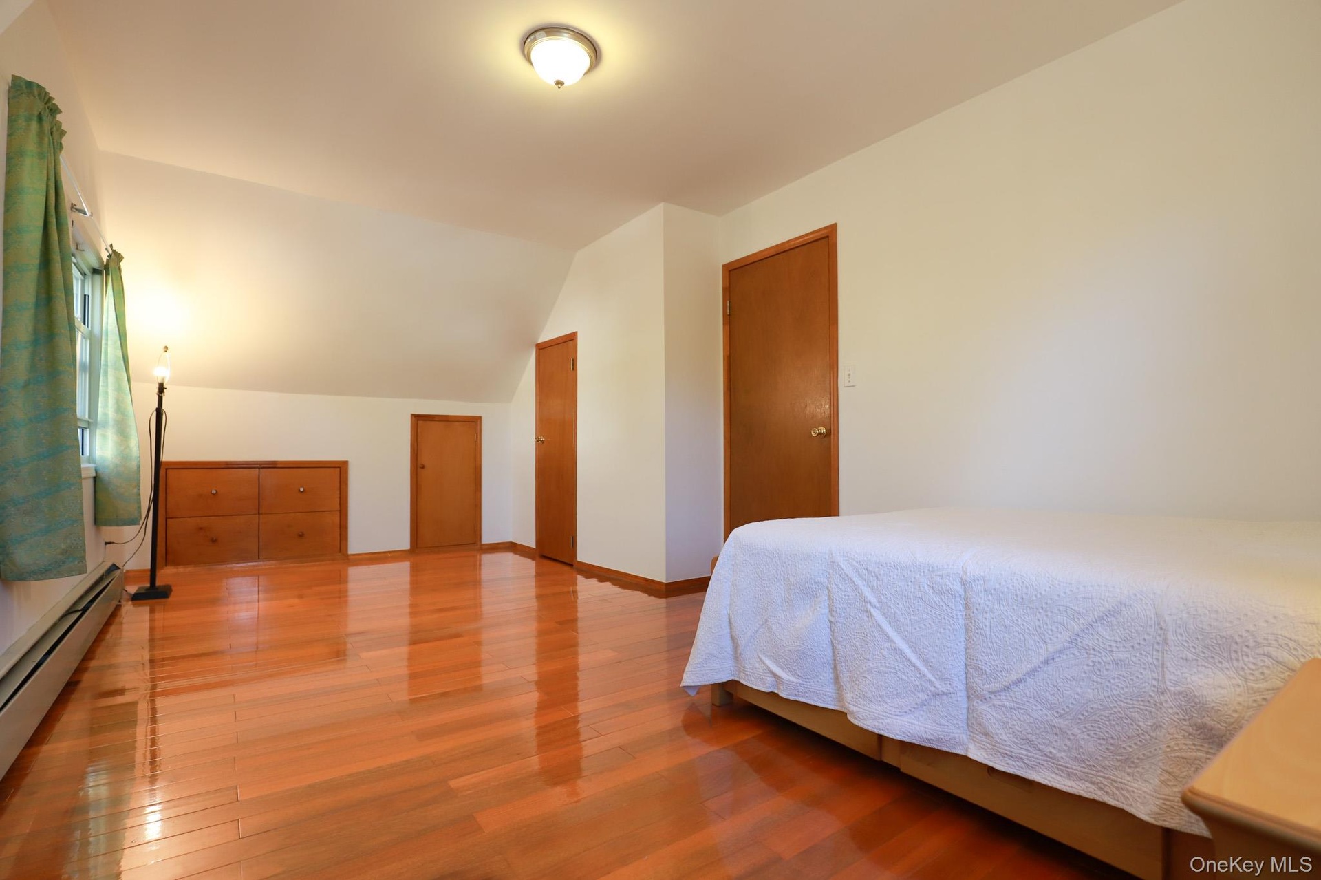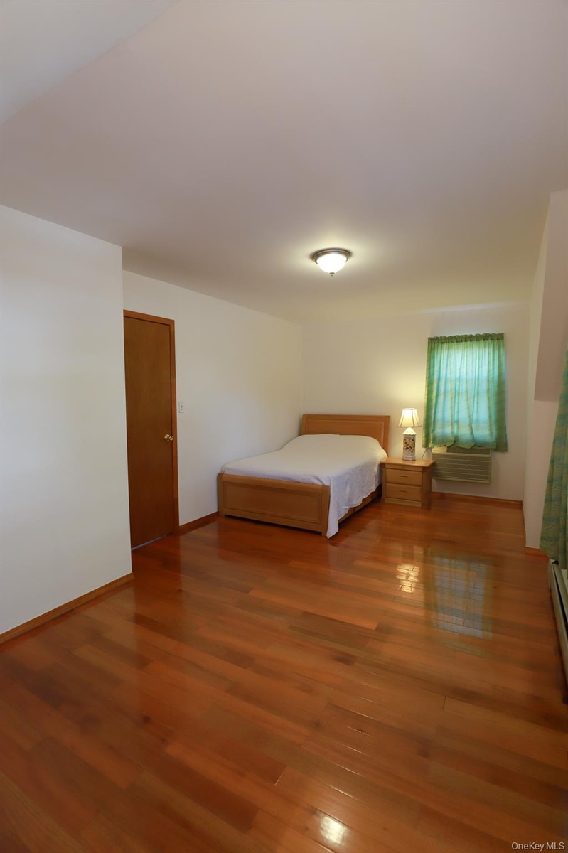 - Bedroom with light wood-style floors and a baseboard heating unit