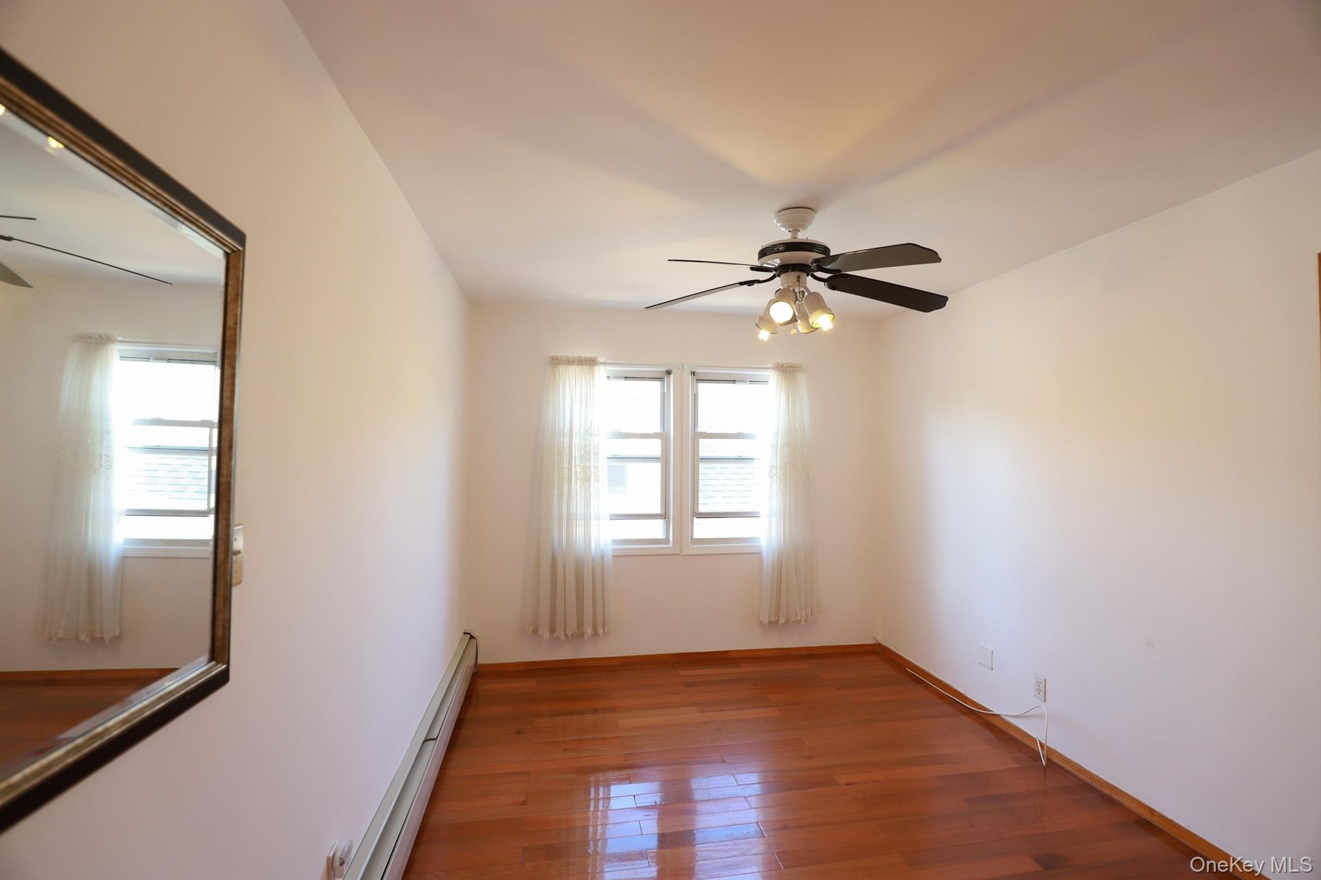 - Empty room with ceiling fan, a baseboard heating unit, and wood-type flooring