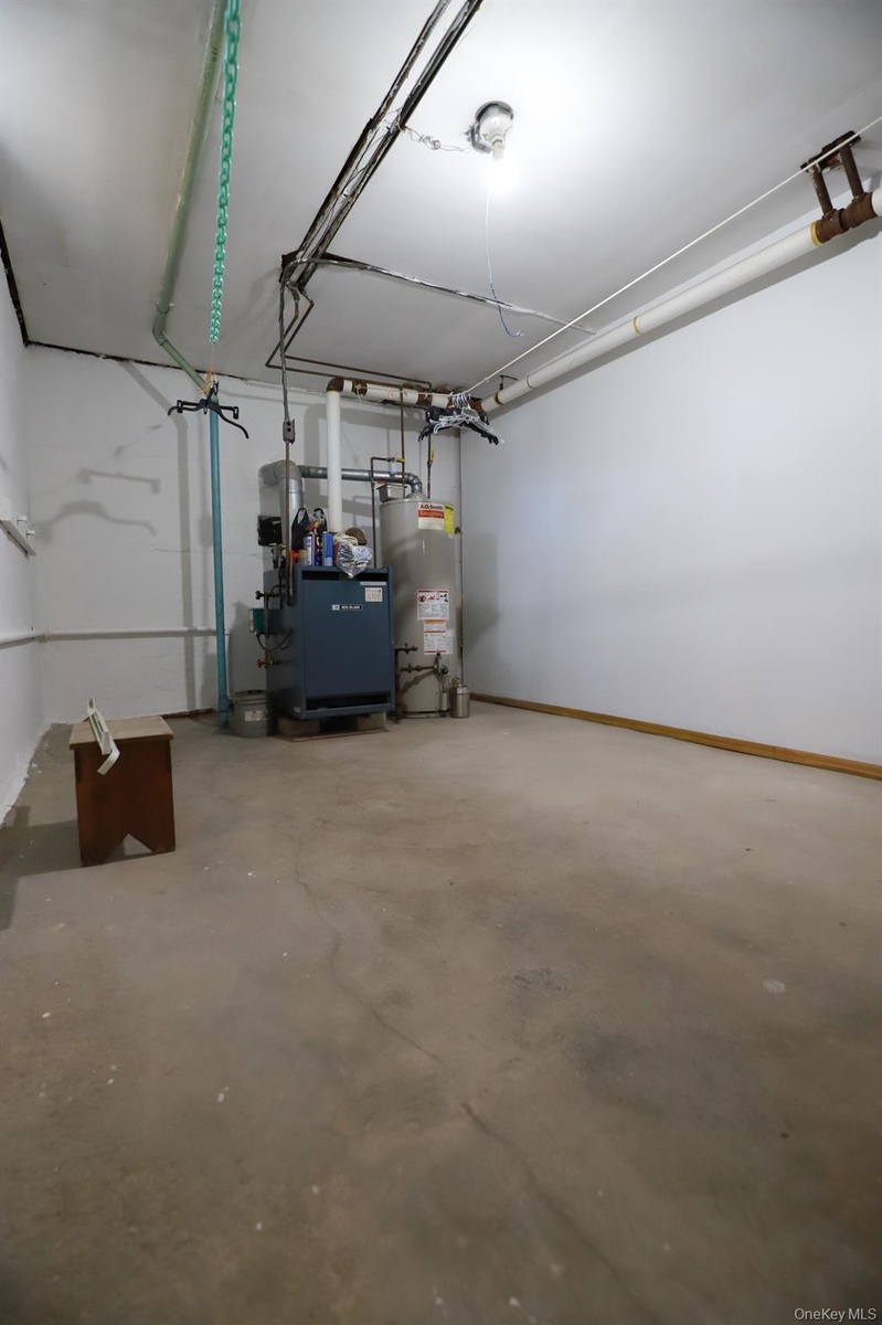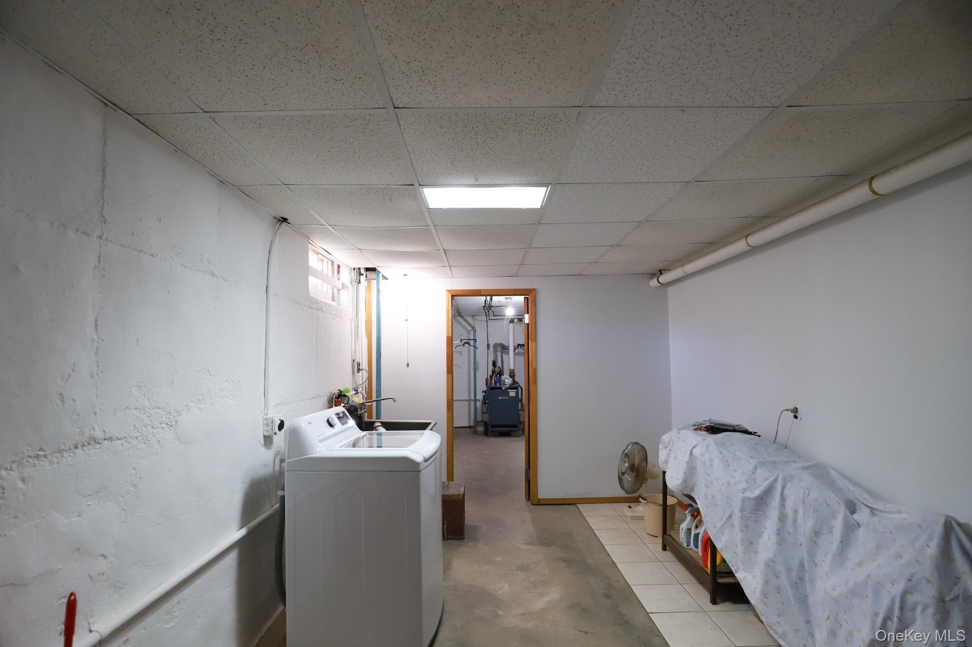 - Finished basement with washer / dryer, a paneled ceiling, and a heating unit