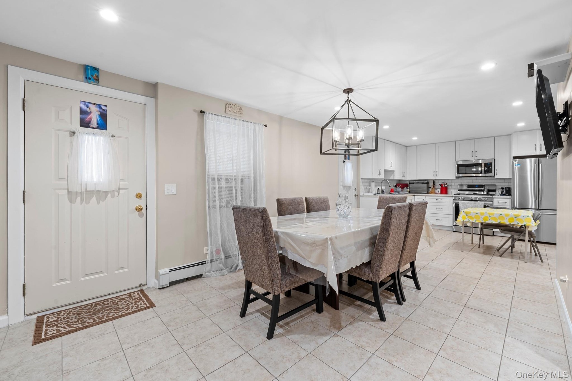 - Dining room featuring light tile patterned flooring, recessed lighting, a baseboard heating unit, a chandelier, and healthy amount of natural light