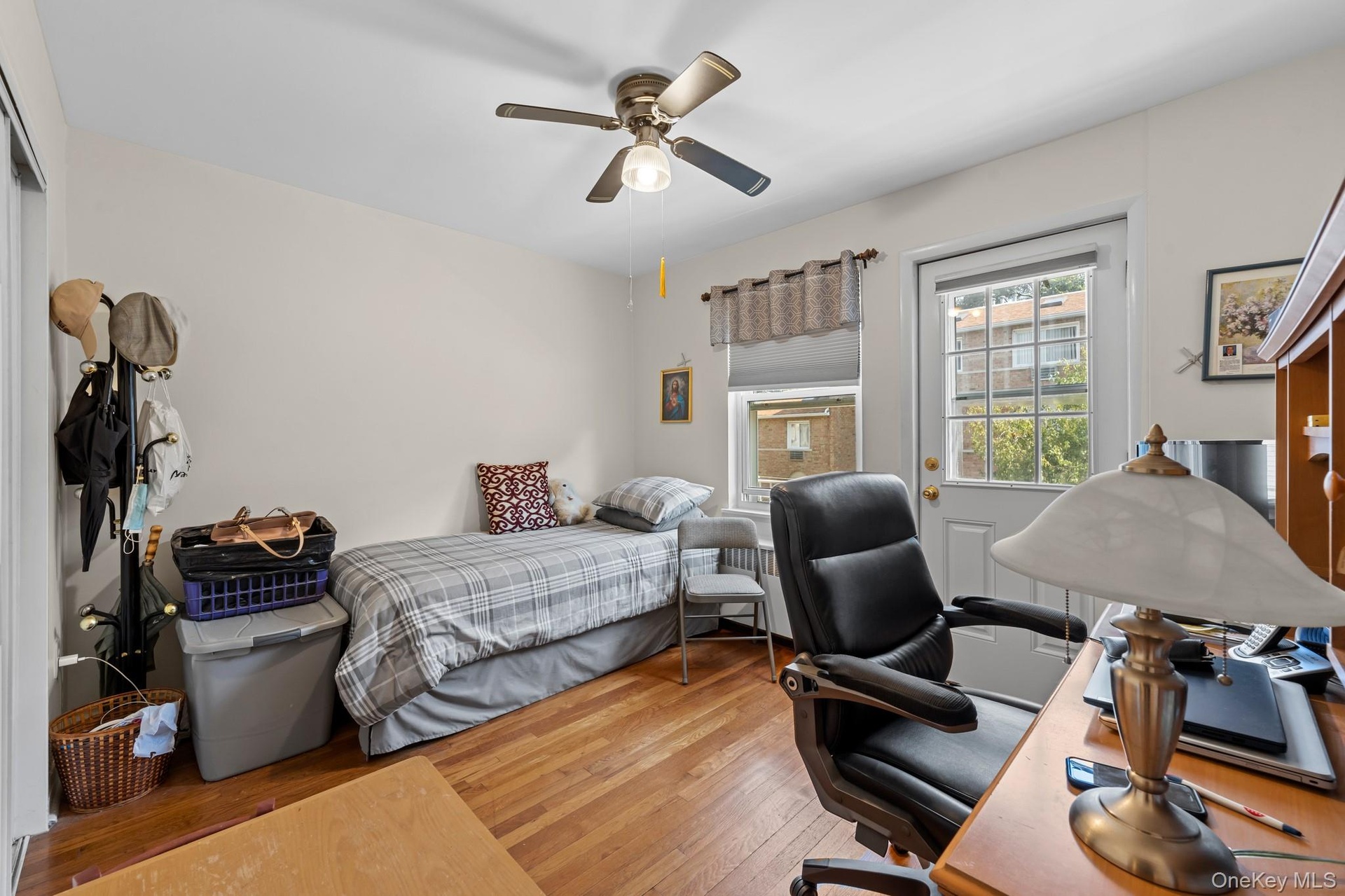 - Bedroom featuring light wood-style flooring, an office area, and a ceiling fan