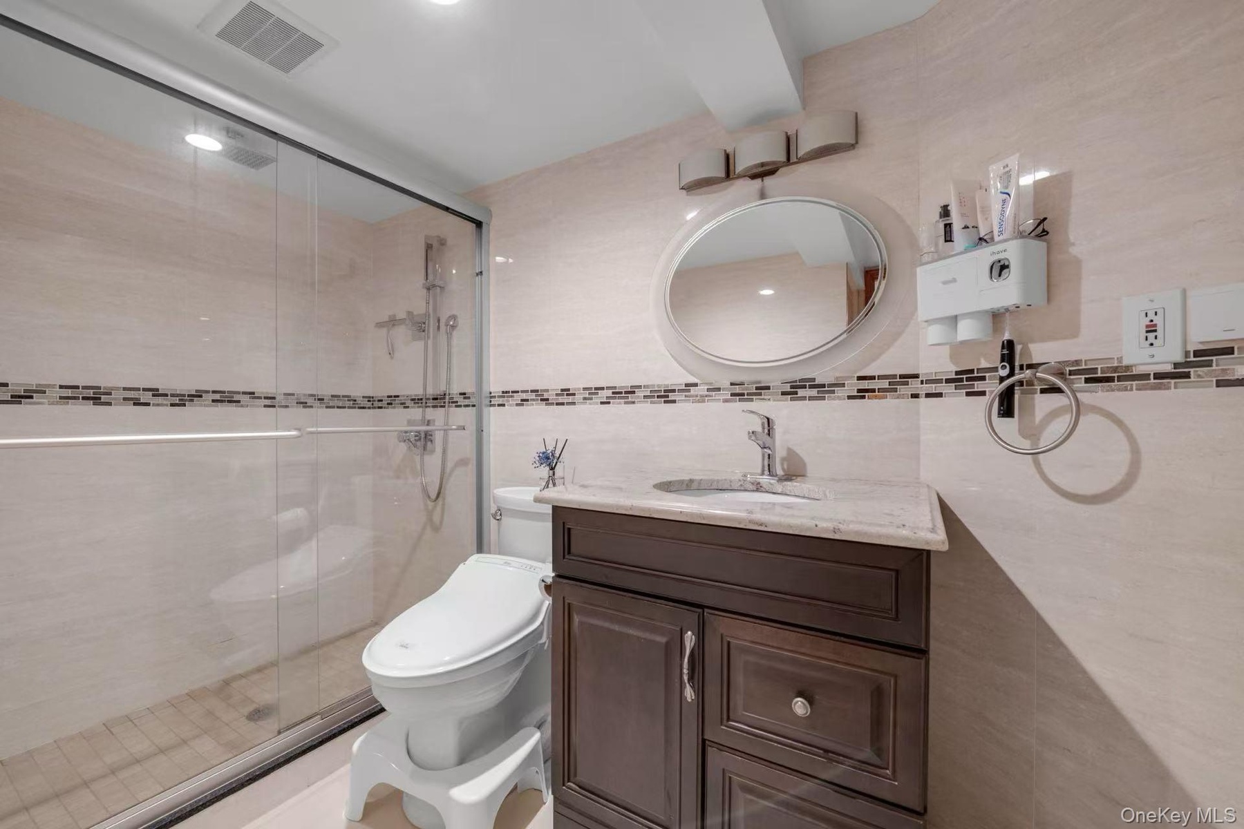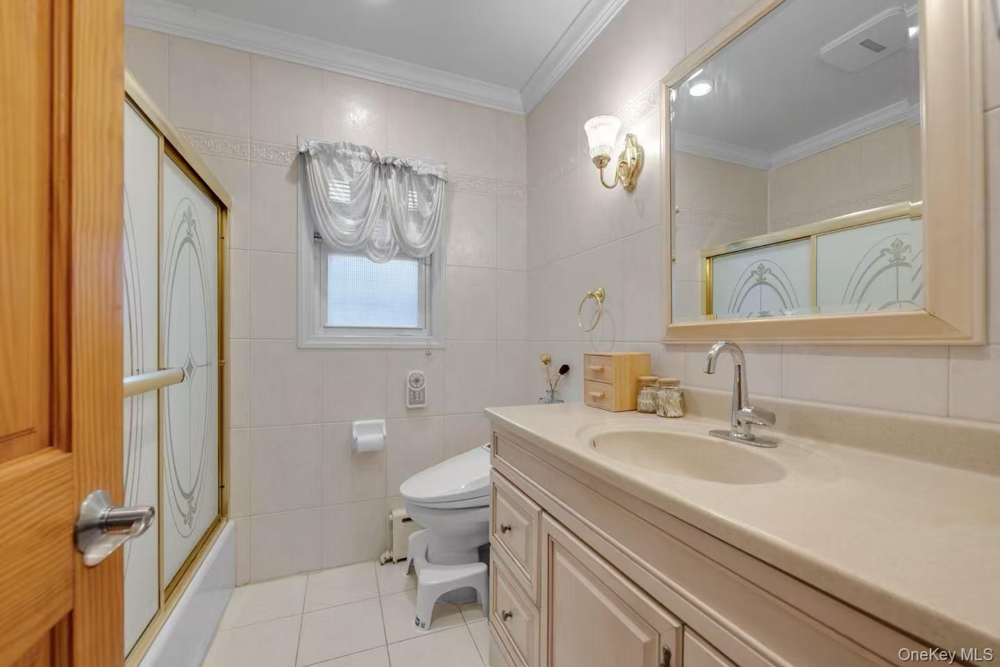 - Full bathroom featuring crown molding, tile walls, combined bath / shower with glass door, vanity, and light tile patterned flooring