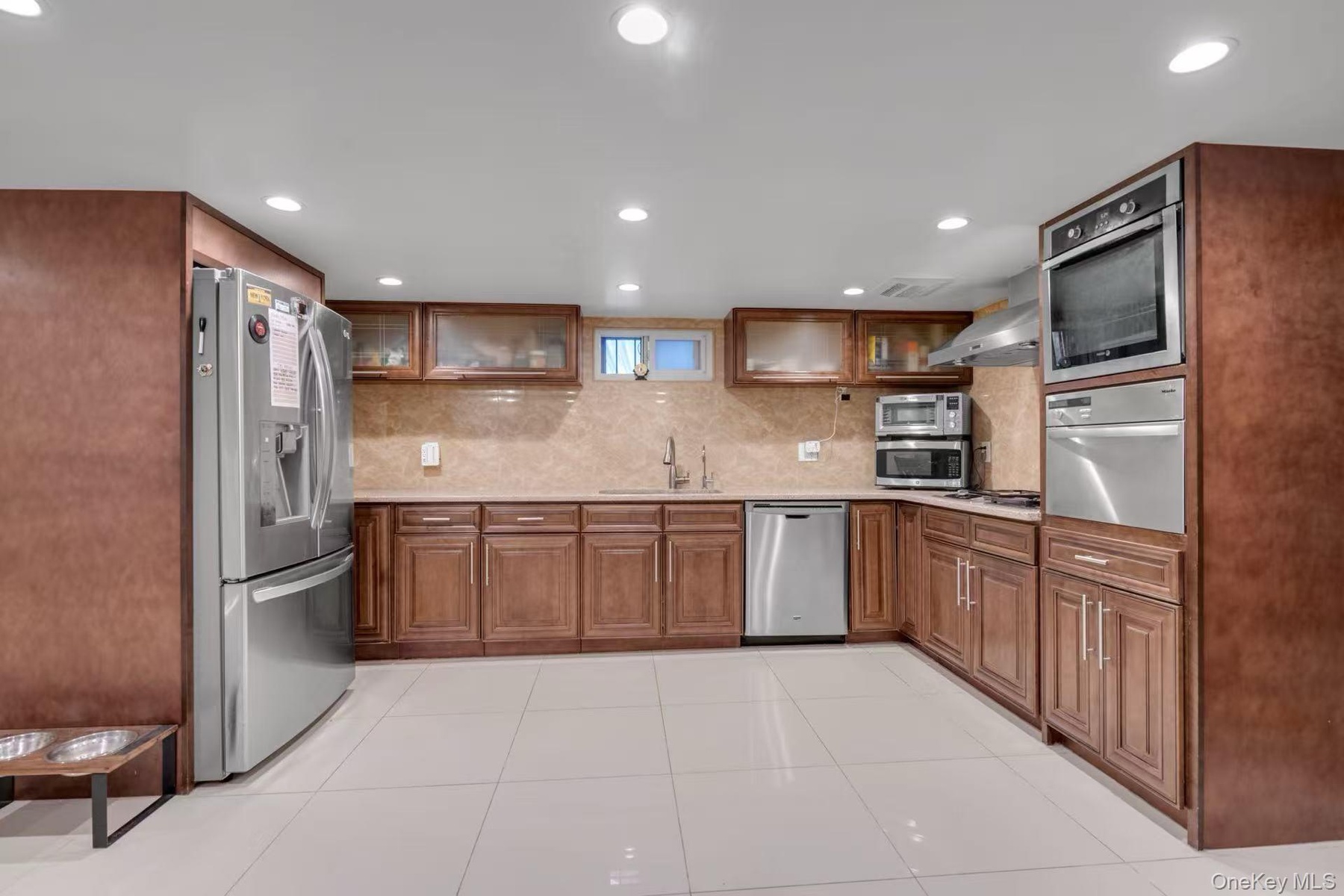 - Kitchen featuring brown cabinets, appliances with stainless steel finishes, decorative backsplash, recessed lighting, and glass insert cabinets