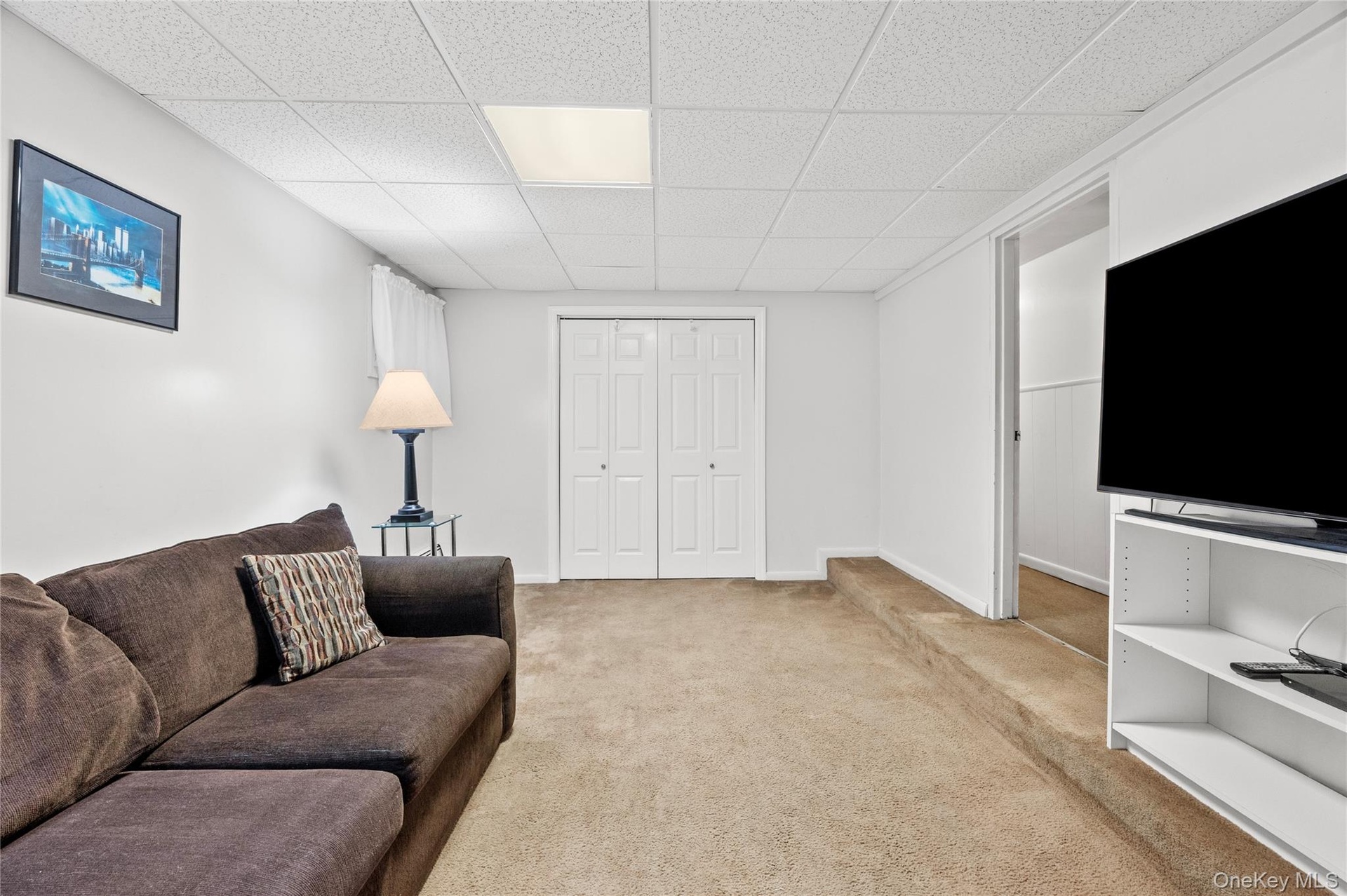 - Living room with a drop ceiling, light colored carpet, stairs, and electric panel